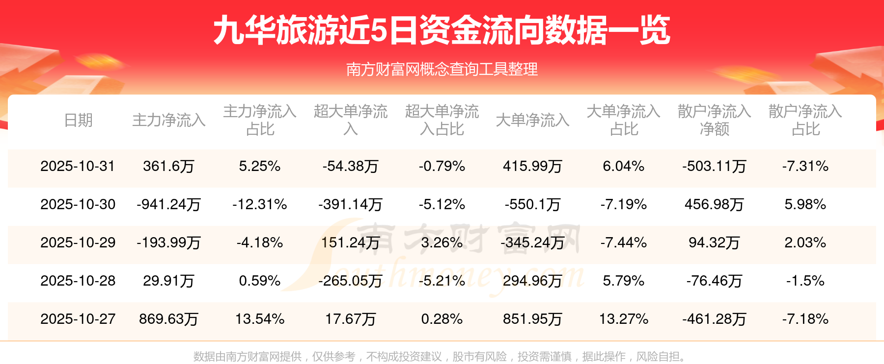 10月31日消息,九华旅游主力资金净流入361.6万元,超大单资金净流出54.38万元,散户资金净流出503.11万元。