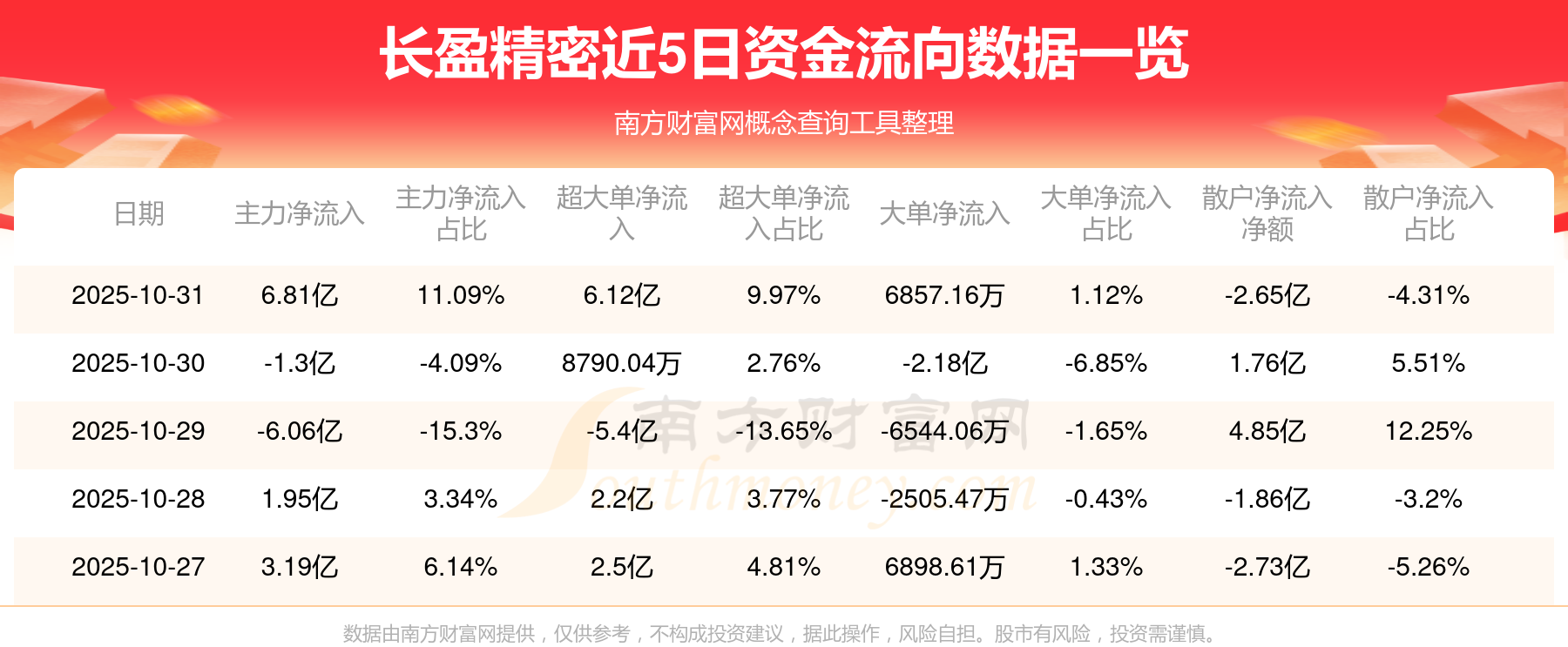 10月31日消息,长盈精密资金净流入6.81亿元,超大单净流入6.12亿元,换手率11.82%,成交金额61.42亿元。