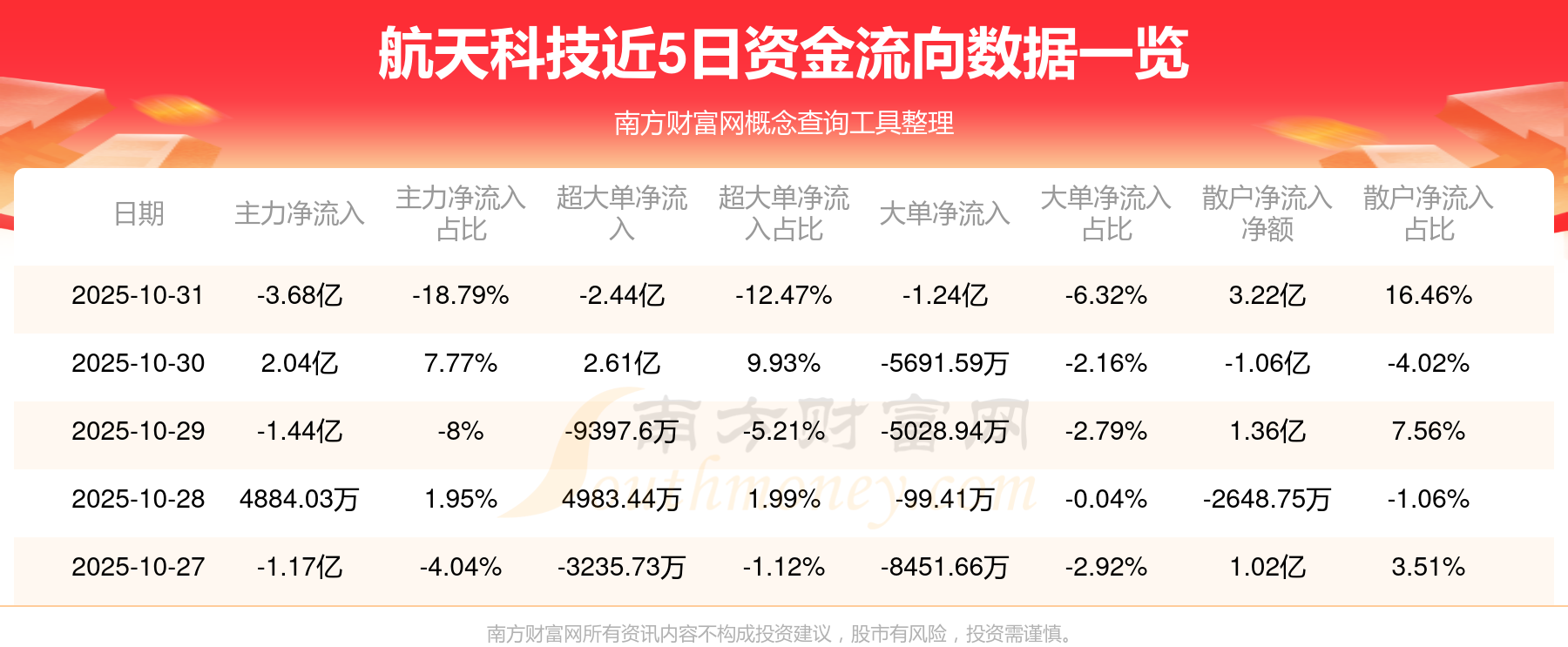 10月31日消息,航天科技资金净流出3.68亿元,超大单净流出2.44亿元,换手率12.54%,成交金额19.56亿元。