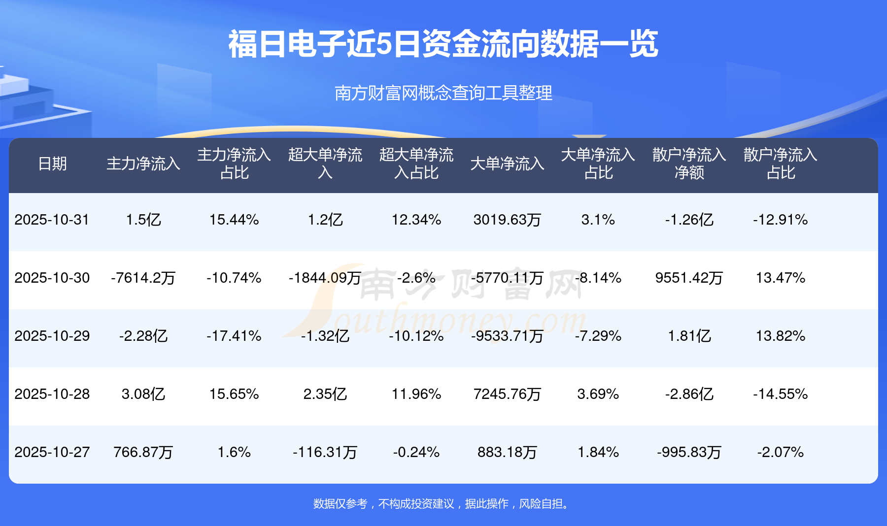 资金流向数据方面,10月31日主力资金净流流入1.5亿元,超大单资金净流入1.2亿元,大单资金净流入3019.63万元,散户资金净流出1.26亿元。
