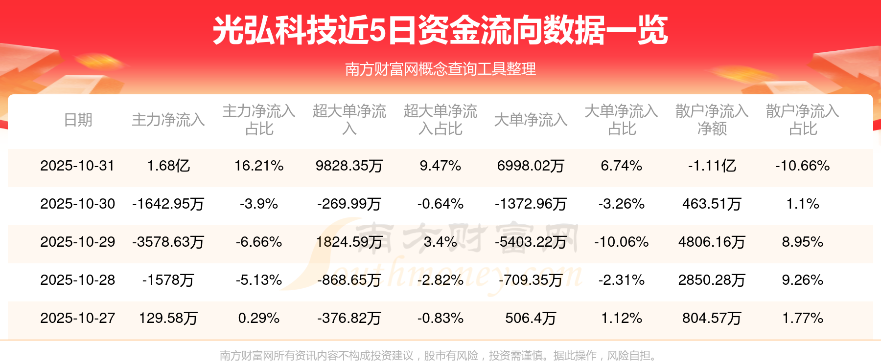 10月31日消息,光弘科技10月31日主力净流入1.68亿元,超大单净流入9828.35万元,大单净流入6998.02万元,散户净流出1.11亿元。