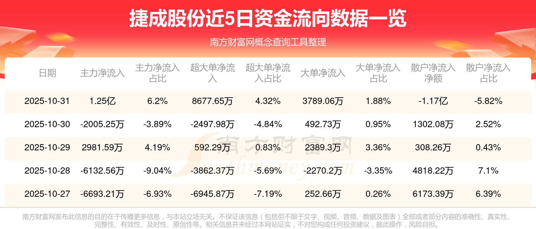 10月31日消息,捷成股份主力资金净流入1.25亿元,超大单资金净流入8677.65万元,散户资金净流出1.17亿元。