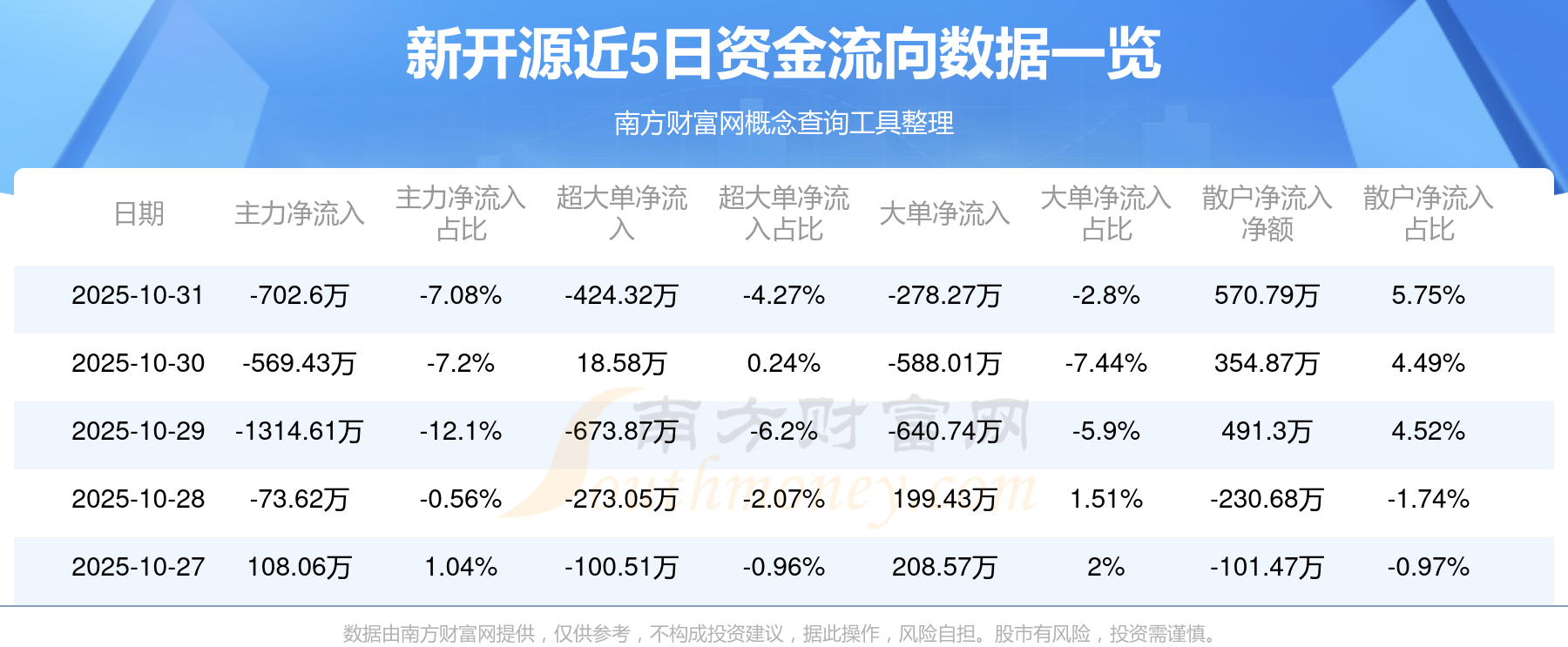 10月31日消息,新开源10月31日主力资金净流出702.6万元,超大单资金净流出424.32万元,大单资金净流出278.27万元,散户资金净流入570.79万元。