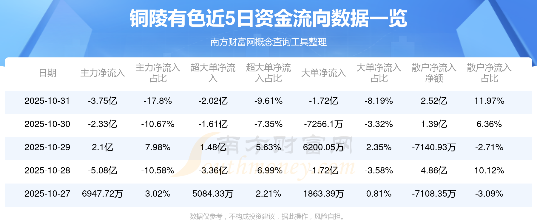 10月31日消息,铜陵有色资金净流出3.75亿元,超大单资金净流出2.02亿元,换手率3.53%,成交金额21.06亿元。
