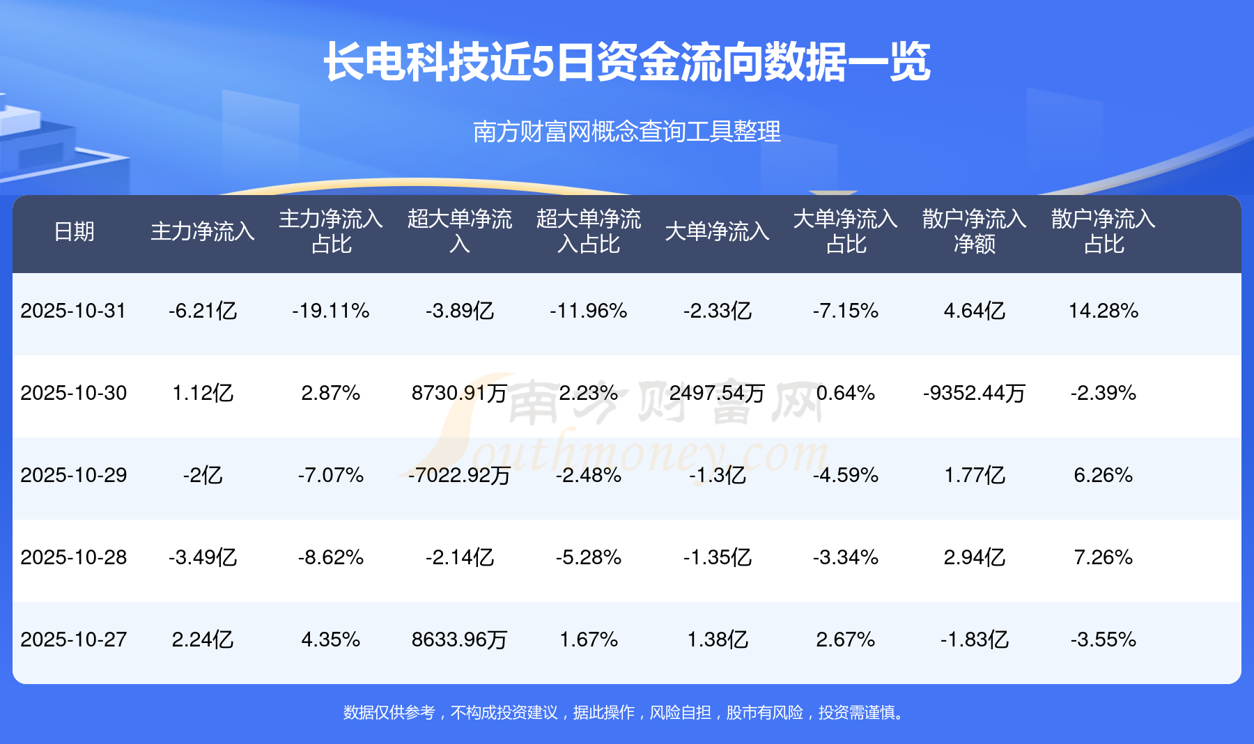 10月31日消息,长电科技资金净流出6.21亿元,超大单净流出3.89亿元,换手率4.49%,成交金额32.52亿元。