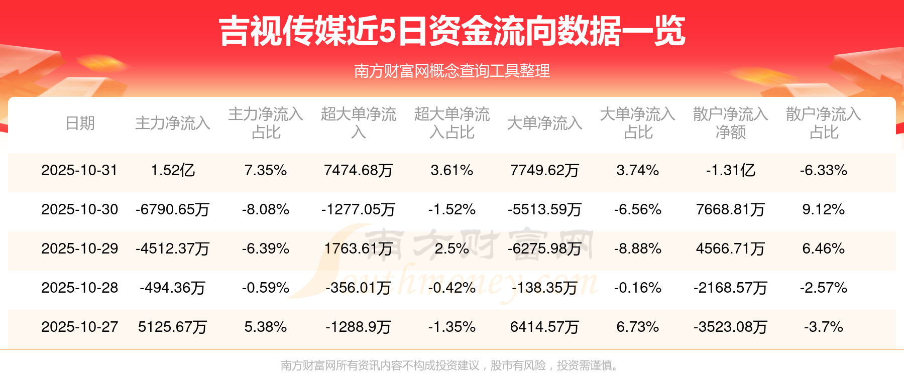 10月31日消息,吉视传媒资金净流入1.52亿元,超大单资金净流入7474.68万元,换手率16.02%,成交金额20.71亿元。