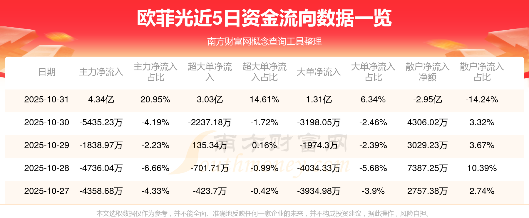 10月31日该股主力净流入4.34亿元,超大单净流入3.03亿元,大单净流入1.31亿元,中单净流出1.39亿元,散户净流出2.95亿元。