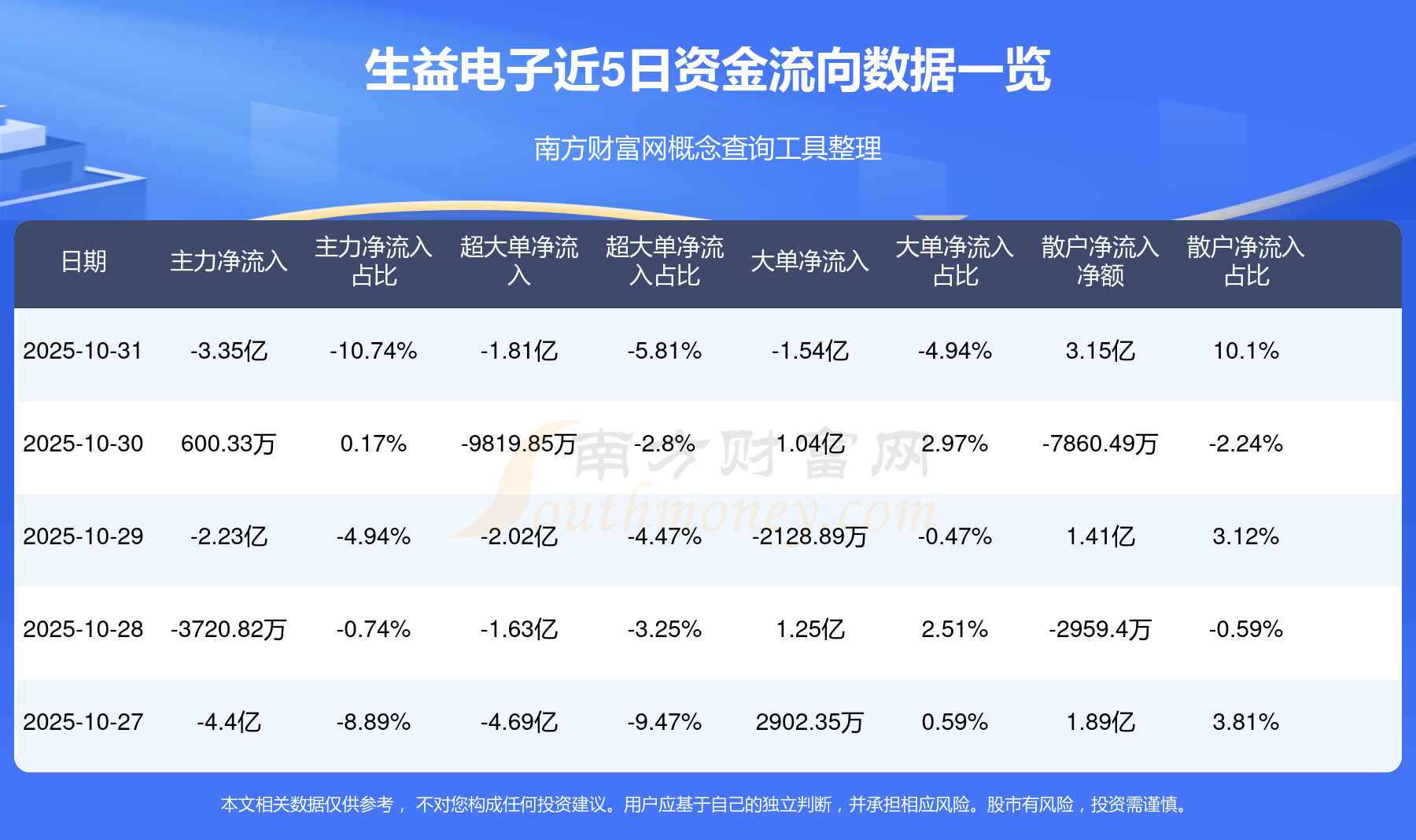 10月31日消息,生益电子主力资金净流出3.35亿元,超大单资金净流出1.81亿元,散户资金净流入3.15亿元。
