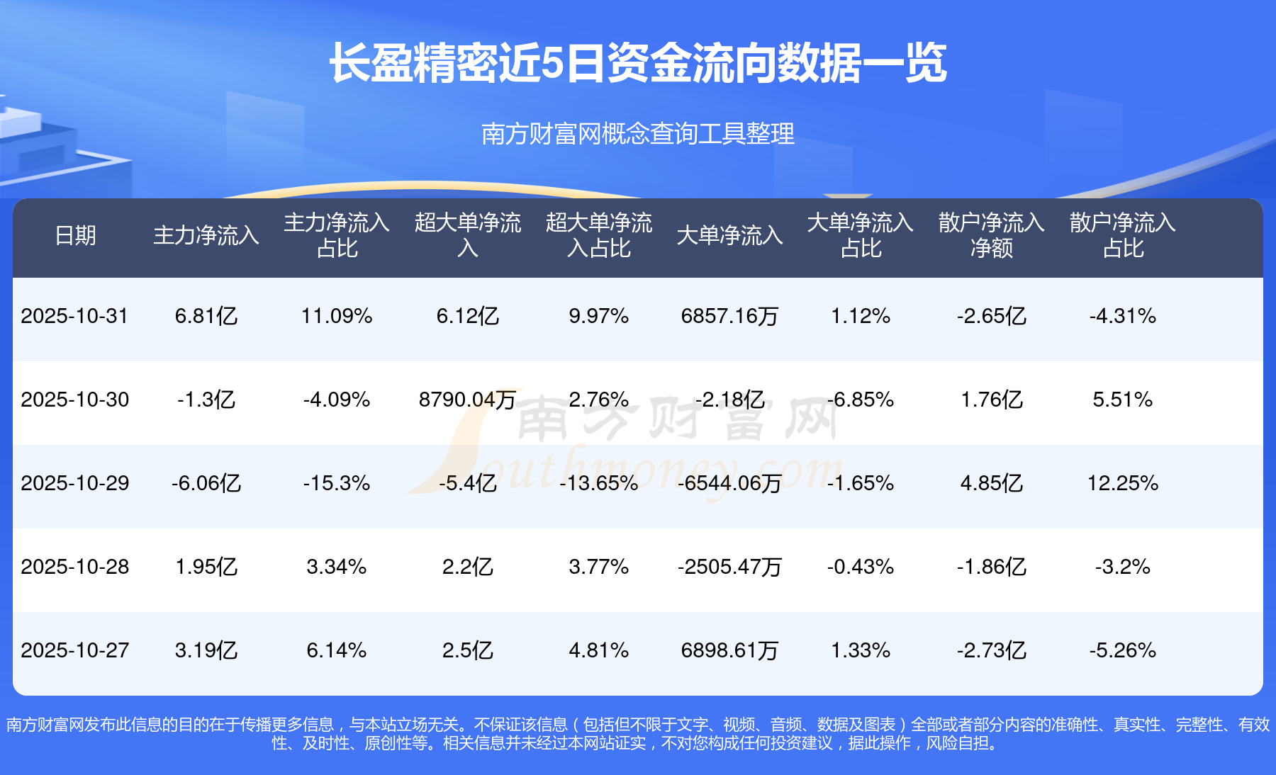 10月31日该股主力净流入6.81亿元,超大单净流入6.12亿元,大单净流入6857.16万元,中单净流出4.16亿元,散户净流出2.65亿元。