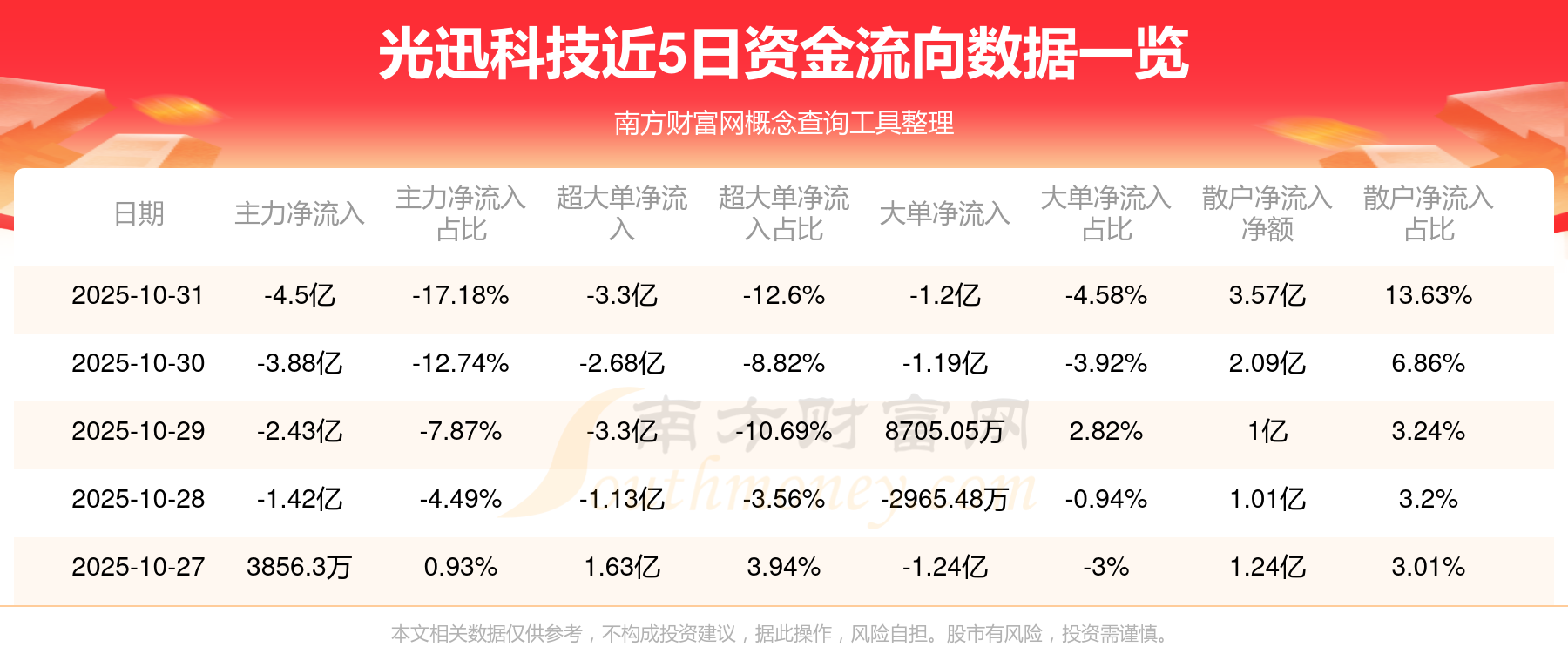 10月31日消息,光迅科技资金净流出4.5亿元,超大单净流出3.3亿元,换手率5.24%,成交金额26.17亿元。
