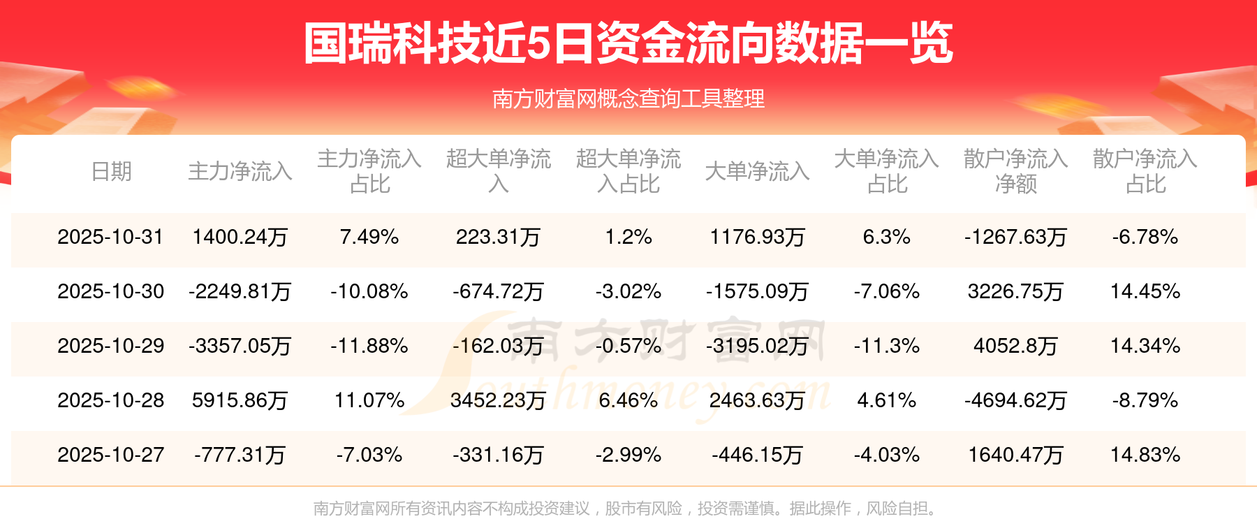 10月31日消息,资金净流入1400.24万元,超大单净流入223.31万元,成交金额1.87亿元。