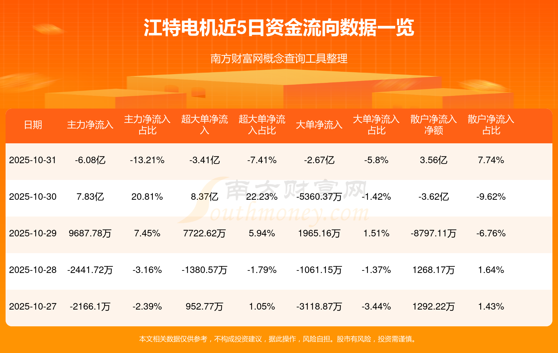 10月31日消息,江特电机主力净流出6.08亿元,超大单净流出3.41亿元,散户净流入3.56亿元。