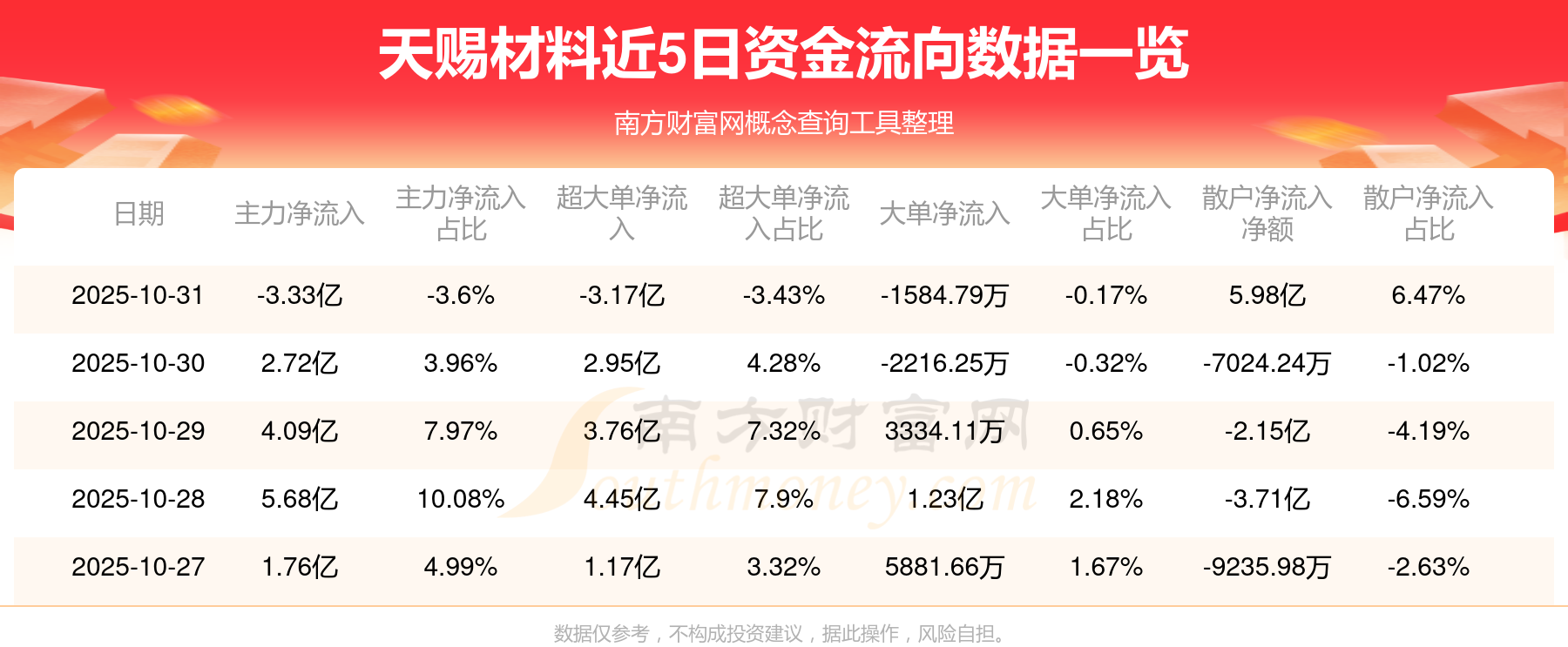 10月31日消息,天赐材料主力资金净流出3.33亿元,超大单资金净流出3.17亿元,散户资金净流入5.98亿元。
