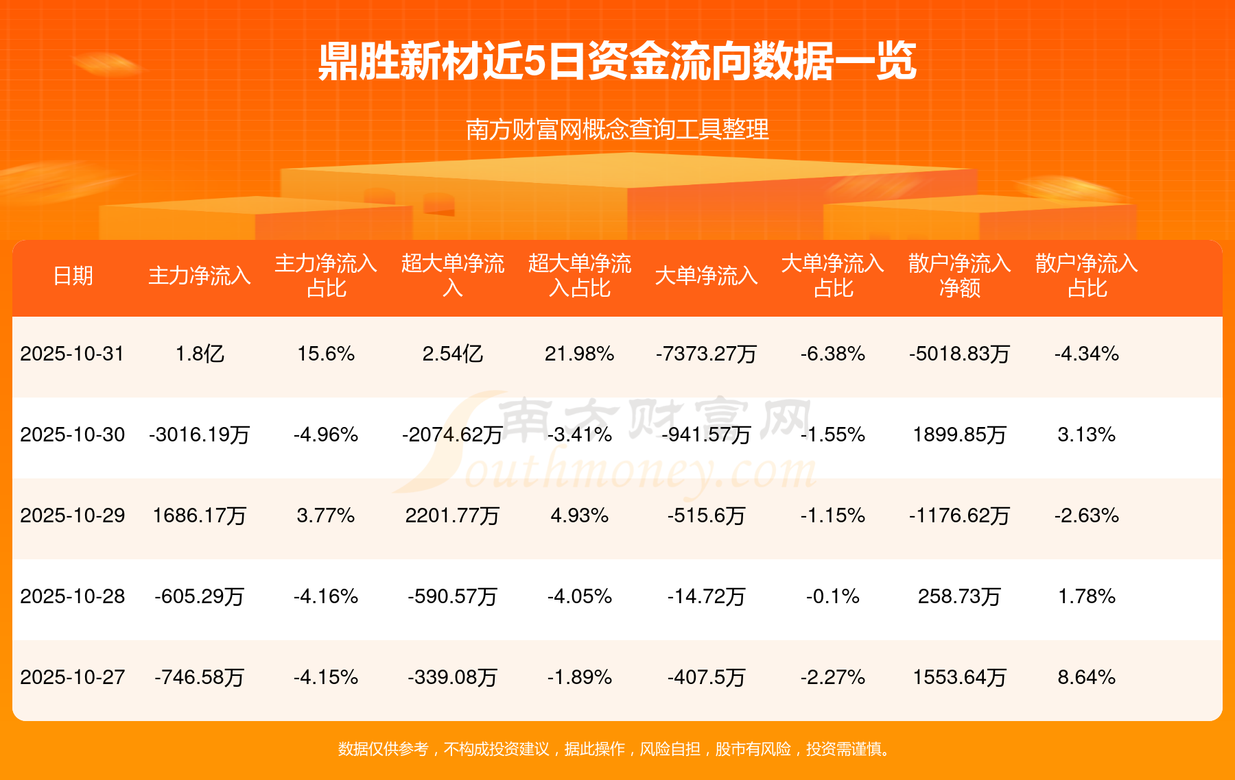 10月31日该股主力资金净流入1.8亿元,超大单资金净流入2.54亿元,大单资金净流出7373.27万元,中单资金净流出1.3亿元,散户资金净流出5018.83万元。