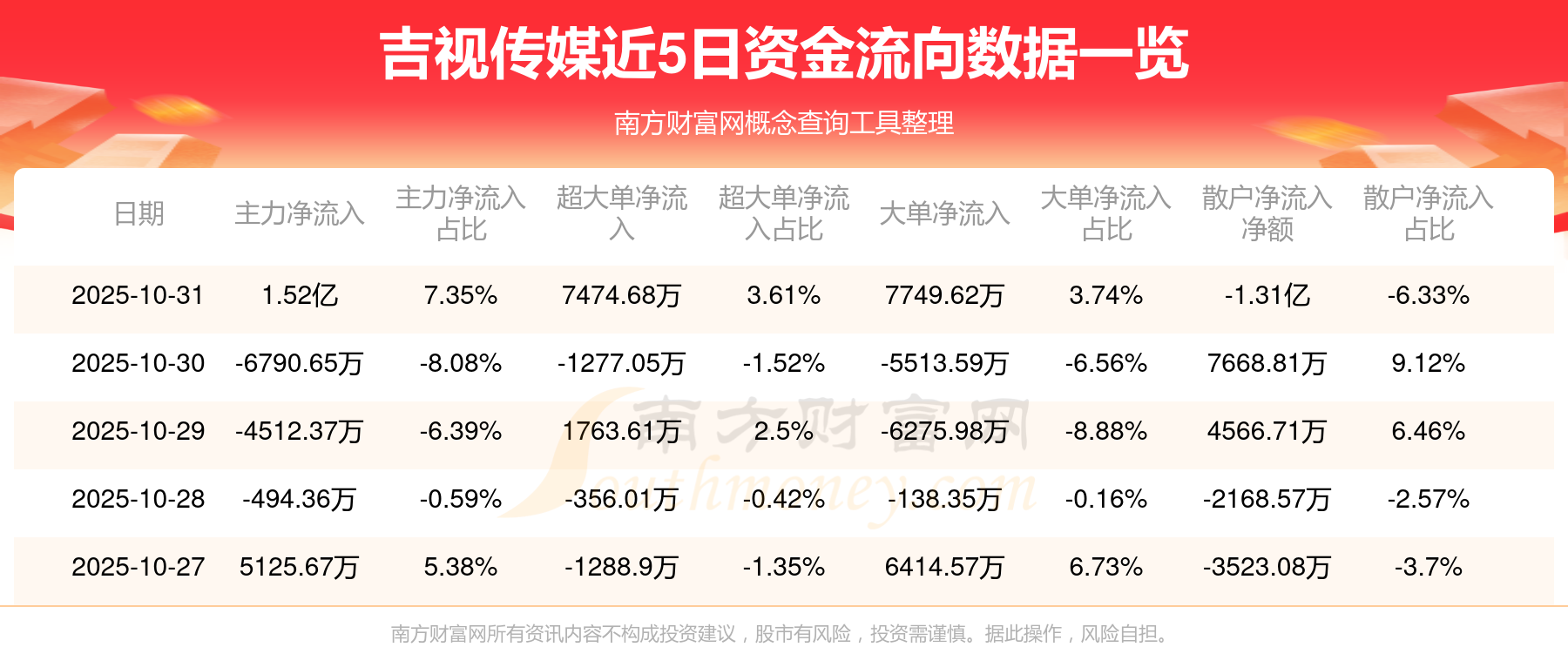 10月31日消息,吉视传媒10月31日主力资金净流入1.52亿元,超大单资金净流入7474.68万元,大单资金净流入7749.62万元,散户资金净流出1.31亿元。