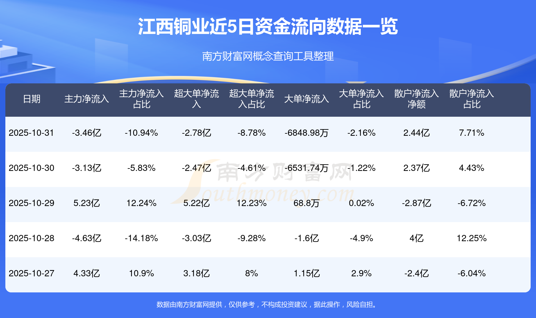 10月31日该股主力资金净流出3.46亿元,超大单资金净流出2.78亿元,大单资金净流出6848.98万元,中单资金净流入1.02亿元,散户资金净流入2.44亿元。