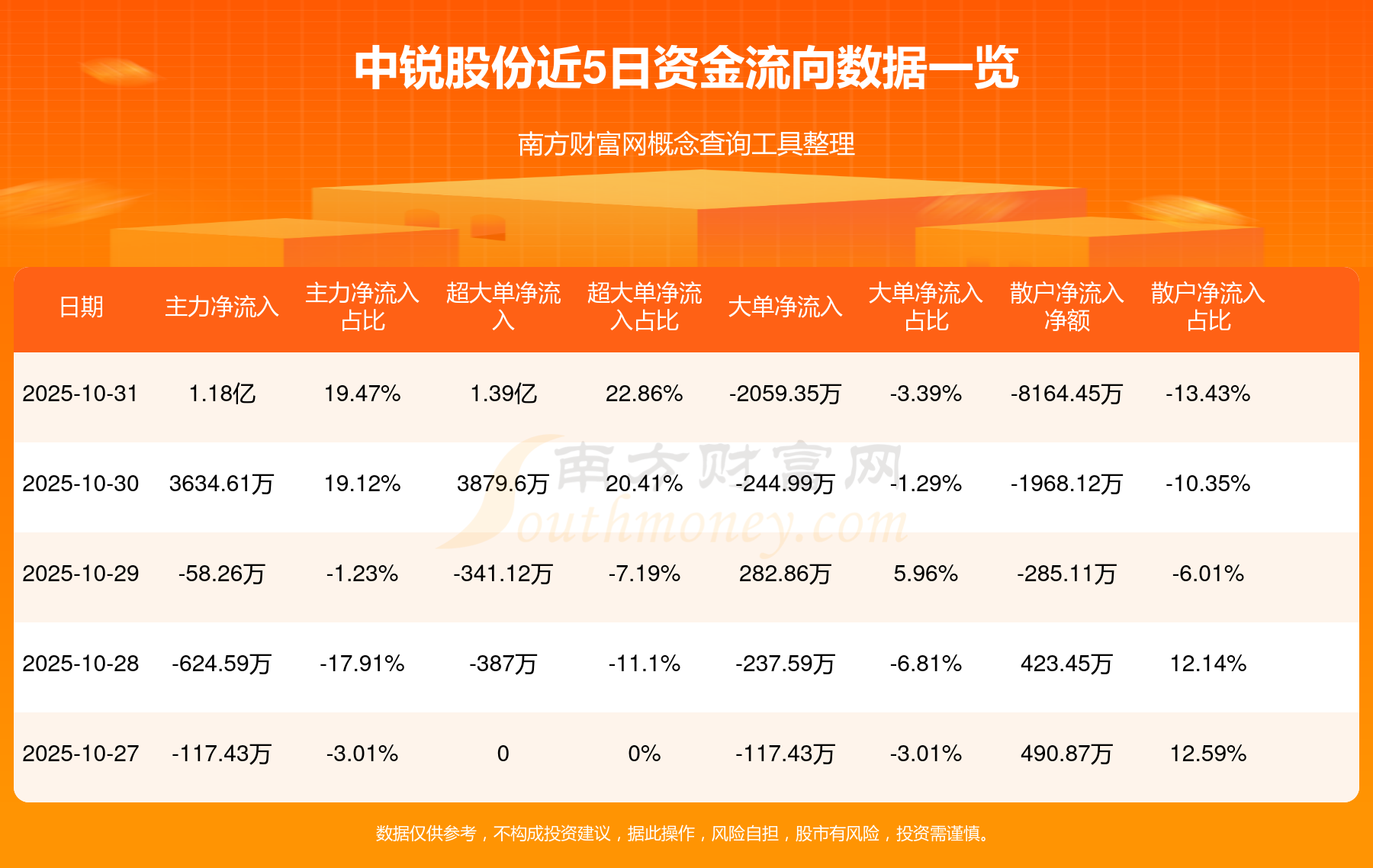 10月31日消息,中锐股份资金净流入1.18亿元,超大单净流入1.39亿元,换手率17.72%,成交金额6.08亿元。