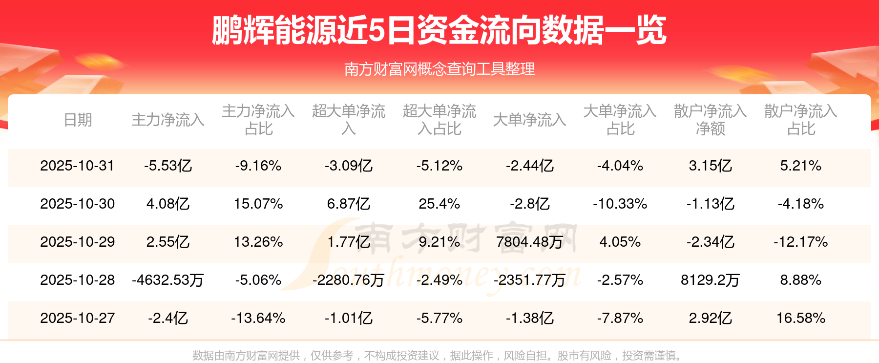 10月31日消息,鹏辉能源10月31日主力资金净流出5.53亿元,超大单资金净流出3.09亿元,大单资金净流出2.44亿元,散户资金净流入3.15亿元。