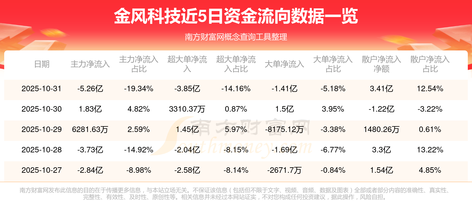 10月31日消息,金风科技主力资金净流出5.26亿元,超大单资金净流出3.85亿元,散户资金净流入3.41亿元。