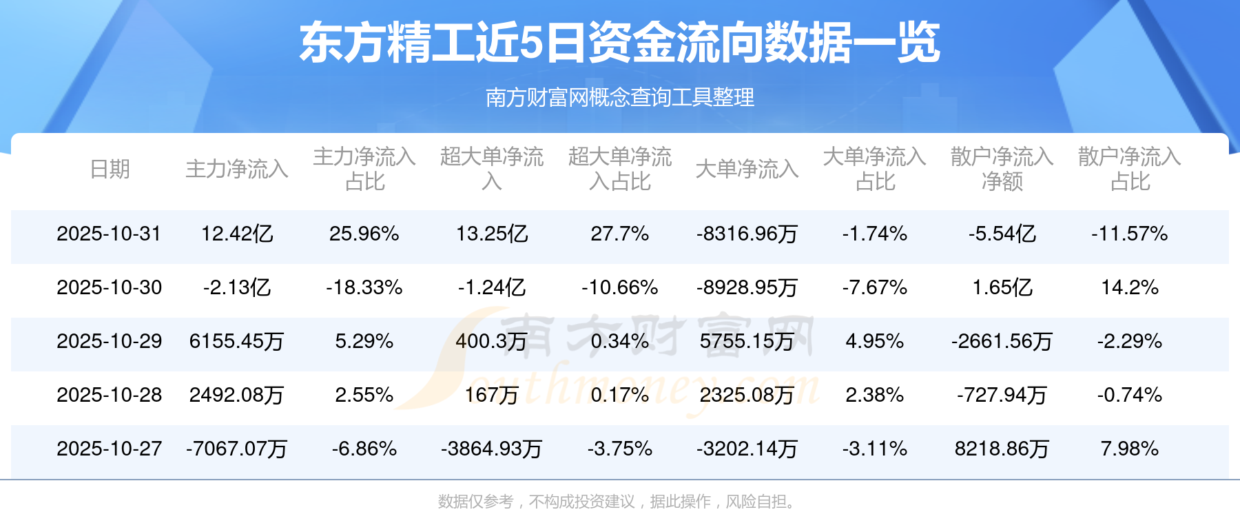 10月31日消息,东方精工10月31日主力净流入12.42亿元,超大单净流入13.25亿元,大单净流出8316.96万元,散户净流出5.54亿元。