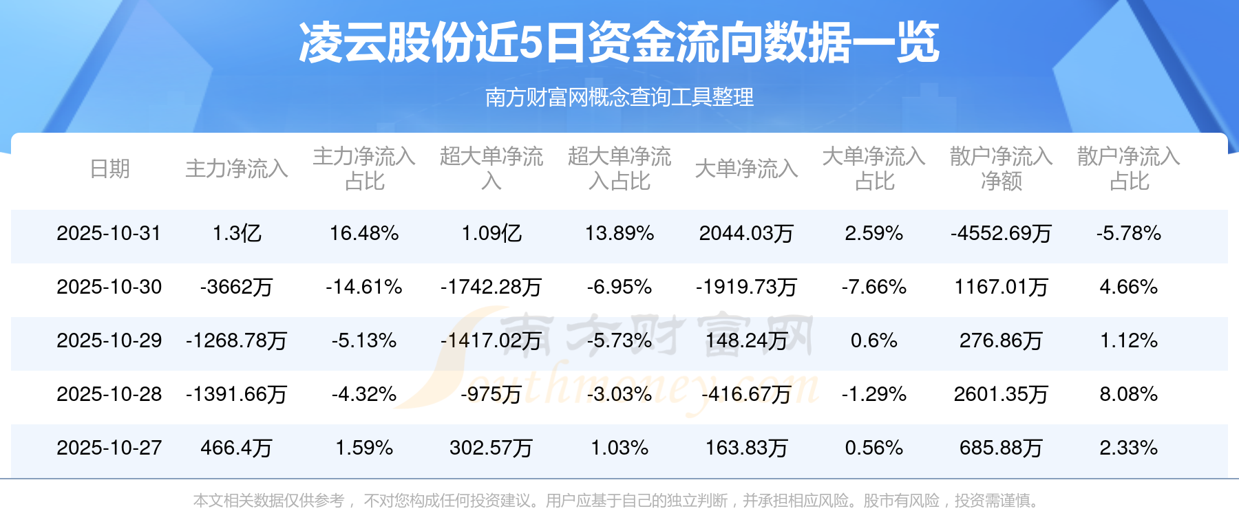 10月31日消息,凌云股份10月31日主力资金净流入1.3亿元,超大单资金净流入1.09亿元,大单资金净流入2044.03万元,散户资金净流出4552.69万元。