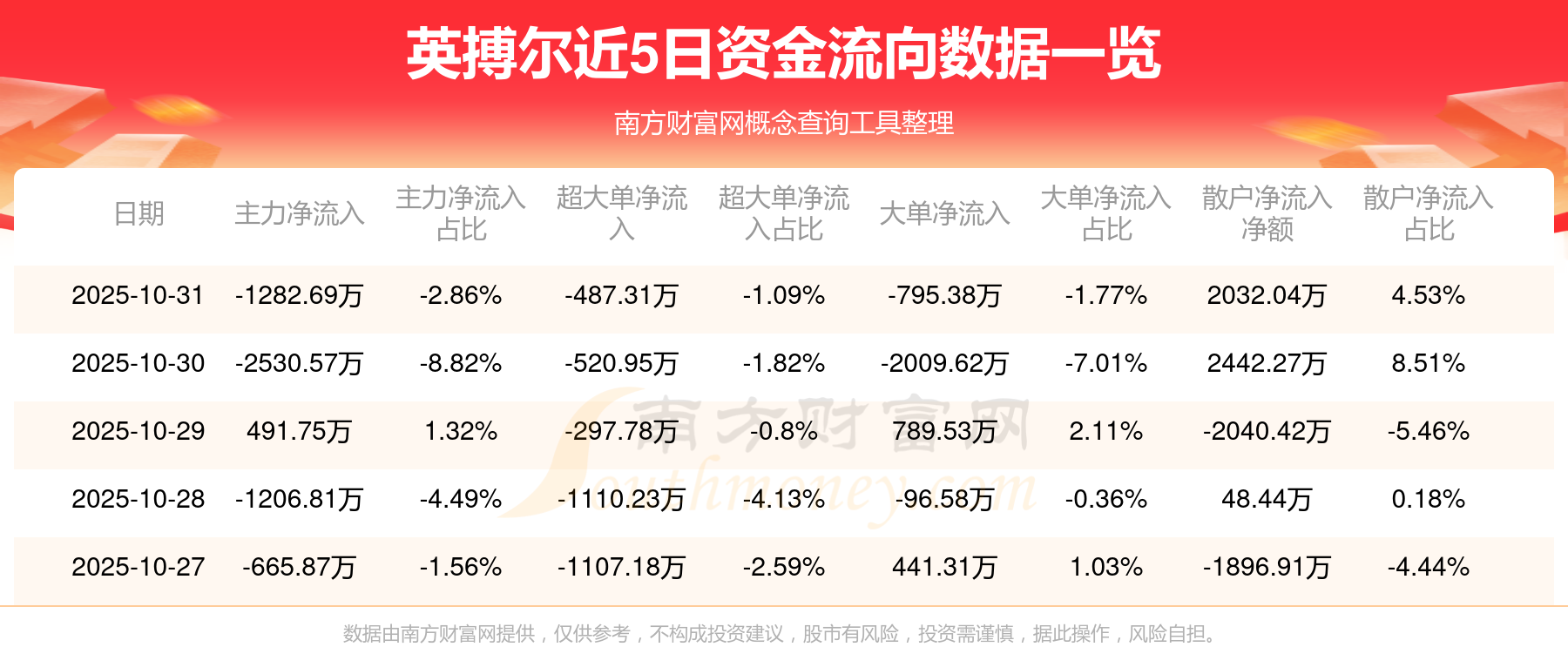 10月31日消息,英搏尔主力净流出1282.69万元,超大单净流出487.31万元,散户净流入2032.04万元。
