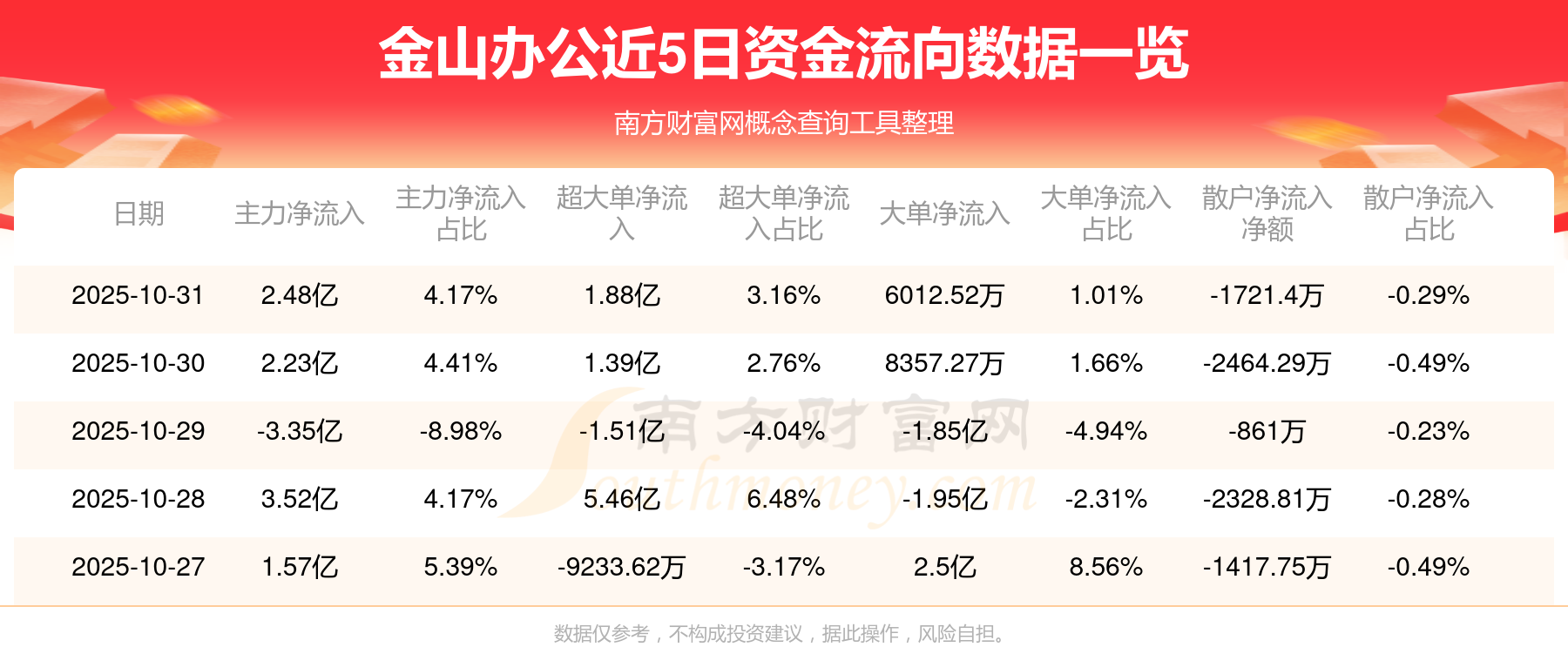 资金流向数据方面,10月31日主力资金净流流入2.48亿元,超大单资金净流入1.88亿元,大单资金净流入6012.52万元,散户资金净流出1721.4万元。