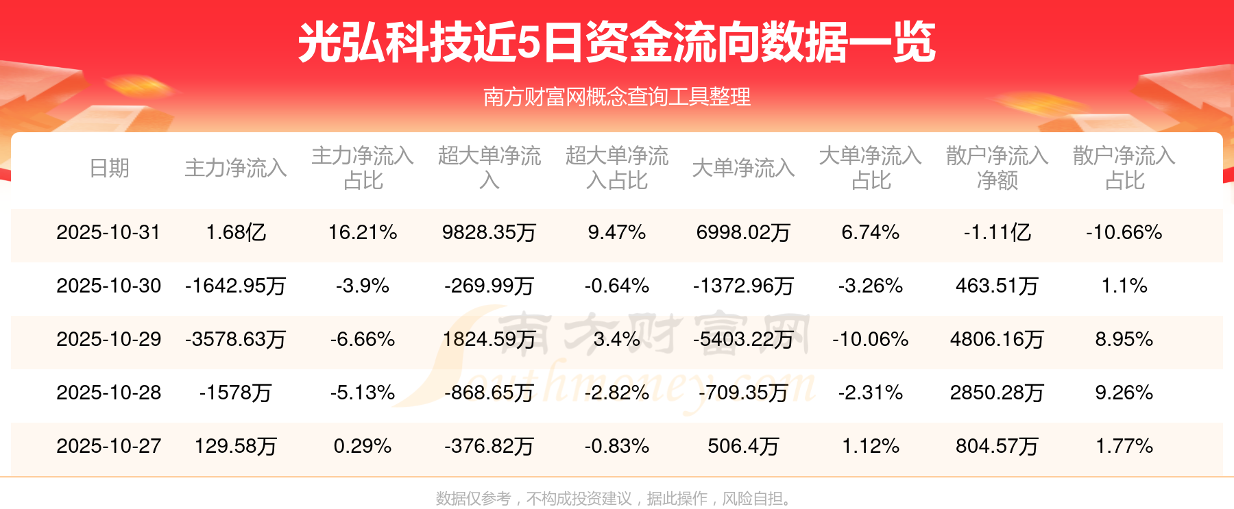 10月31日该股主力资金净流入1.68亿元,超大单资金净流入9828.35万元,大单资金净流入6998.02万元,中单资金净流出5762.63万元,散户资金净流出1.11亿元。