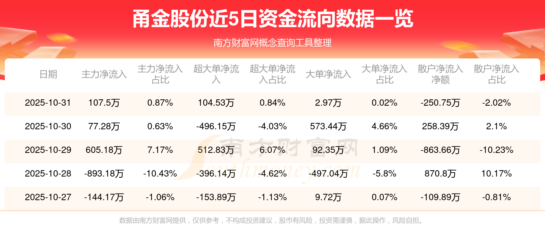 10月31日消息,甬金股份10月31日主力资金净流入107.5万元,超大单资金净流入104.53万元,大单资金净流入2.97万元,散户资金净流出250.75万元。