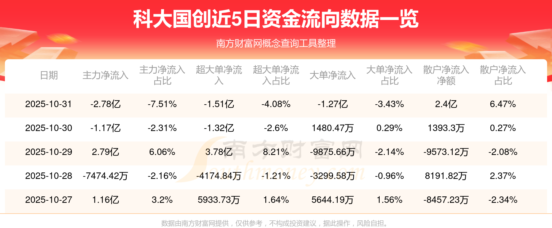 10月31日消息,科大国创10月31日主力资金净流出2.78亿元,超大单资金净流出1.51亿元,大单资金净流出1.27亿元,散户资金净流入2.4亿元。