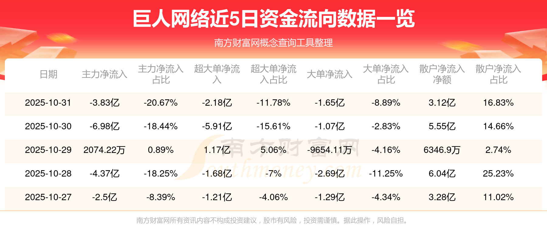 10月31日该股主力资金净流出3.83亿元,超大单资金净流出2.18亿元,大单资金净流出1.65亿元,中单资金净流入7110.94万元,散户资金净流入3.12亿元。