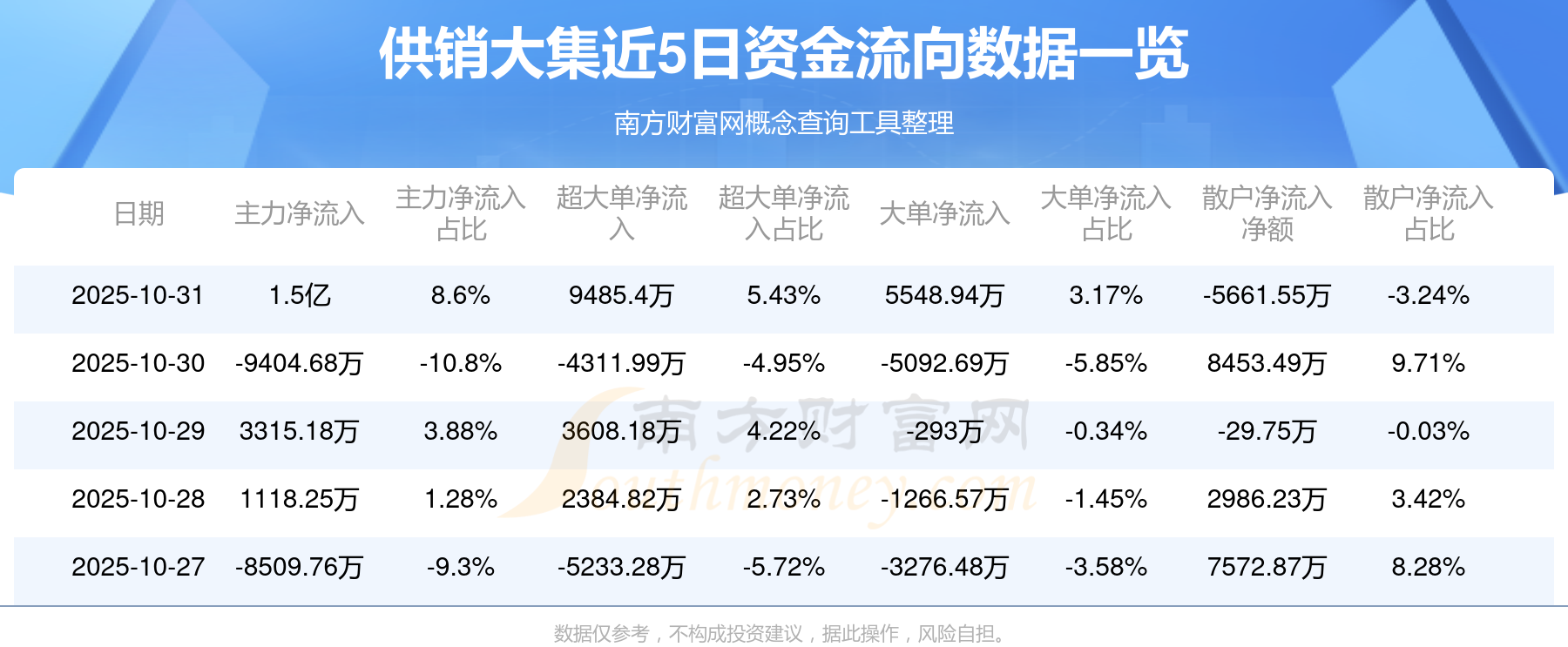 10月31日消息,供销大集10月31日主力资金净流入1.5亿元,超大单资金净流入9485.4万元,大单资金净流入5548.94万元,散户资金净流出5661.55万元。