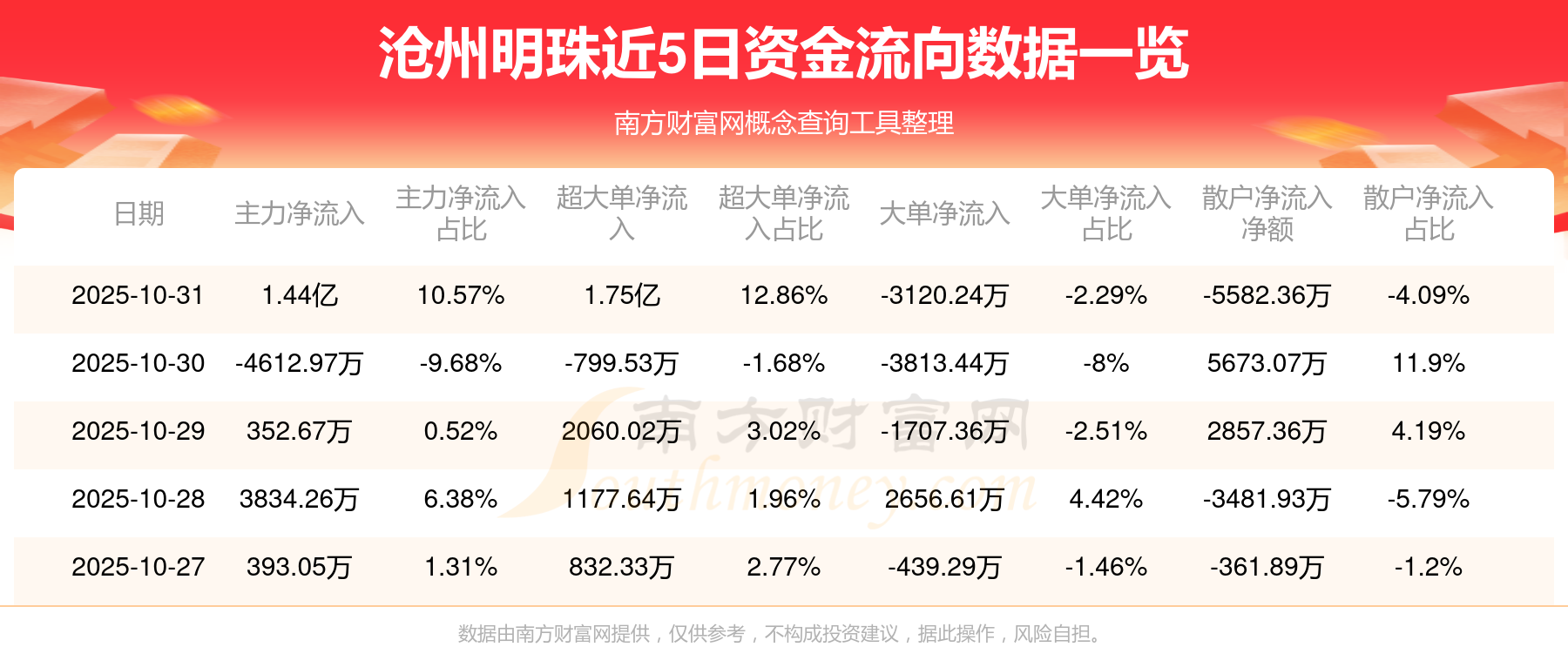 10月31日消息,沧州明珠10月31日主力资金净流入1.44亿元,超大单资金净流入1.75亿元,大单资金净流出3120.24万元,散户资金净流出5582.36万元。