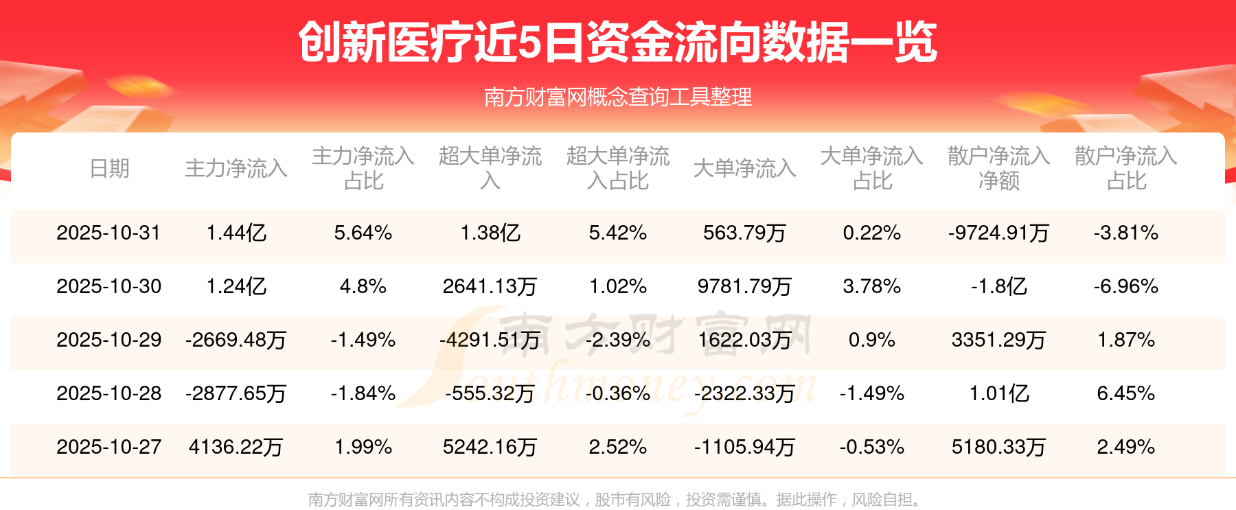 10月31日消息,创新医疗主力净流入1.44亿元,超大单净流入1.38亿元,散户净流出9724.91万元。