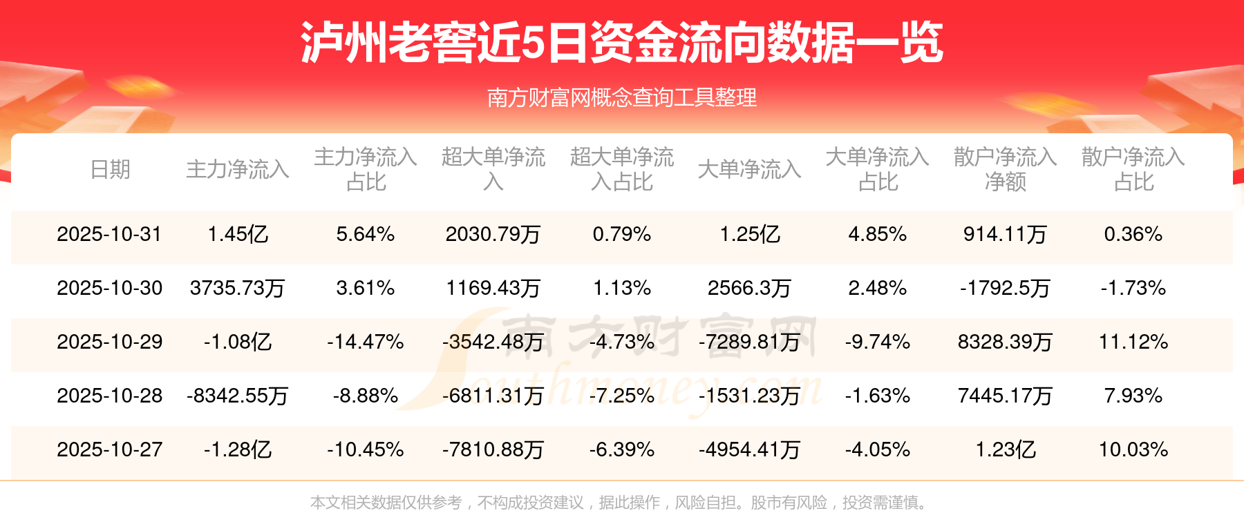 10月31日消息,泸州老窖主力净流入1.45亿元,超大单净流入2030.79万元,散户净流入914.11万元。