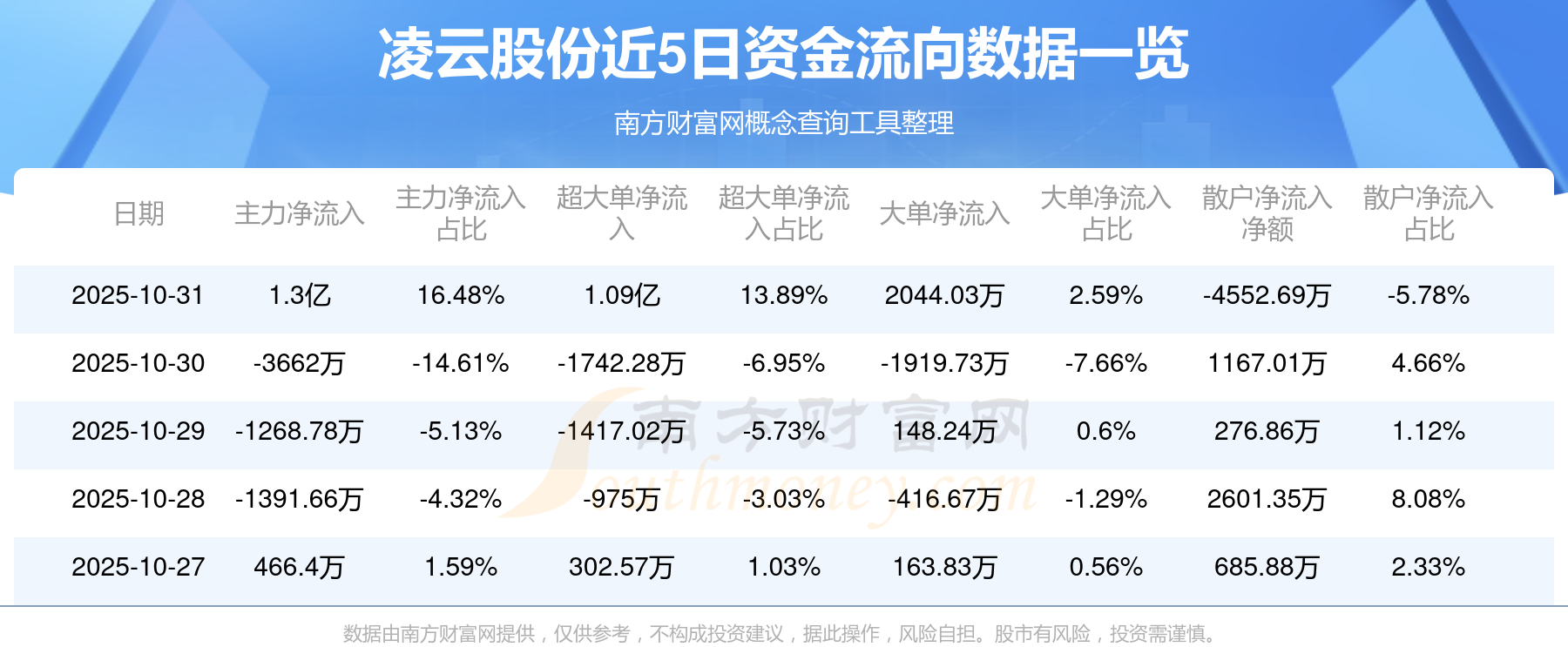 10月31日该股主力资金净流入1.3亿元,超大单资金净流入1.09亿元,大单资金净流入2044.03万元,中单资金净流出8432.02万元,散户资金净流出4552.69万元。