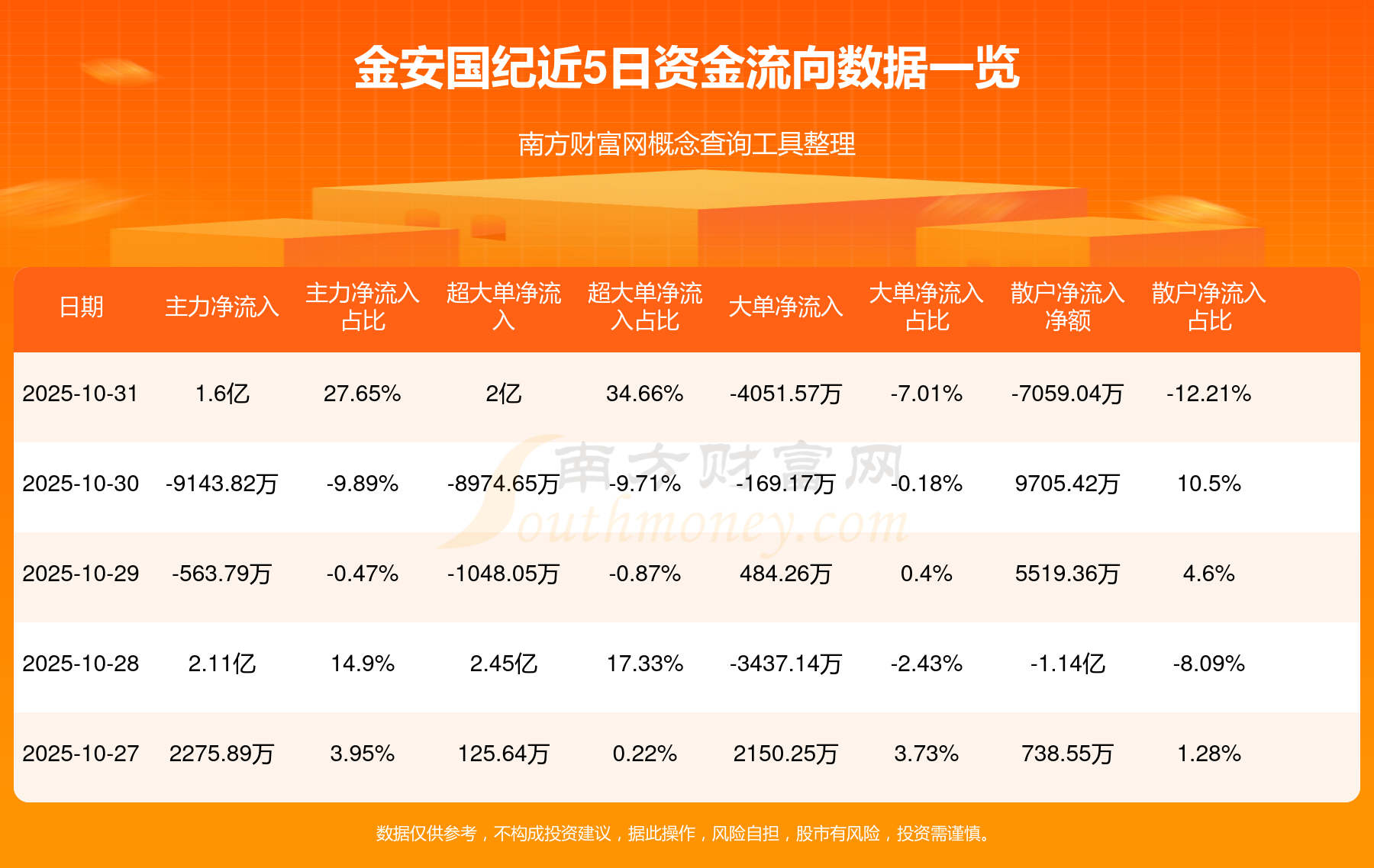 10月31日消息,金安国纪主力资金净流入1.6亿元,超大单资金净流入2亿元,散户资金净流出7059.04万元。