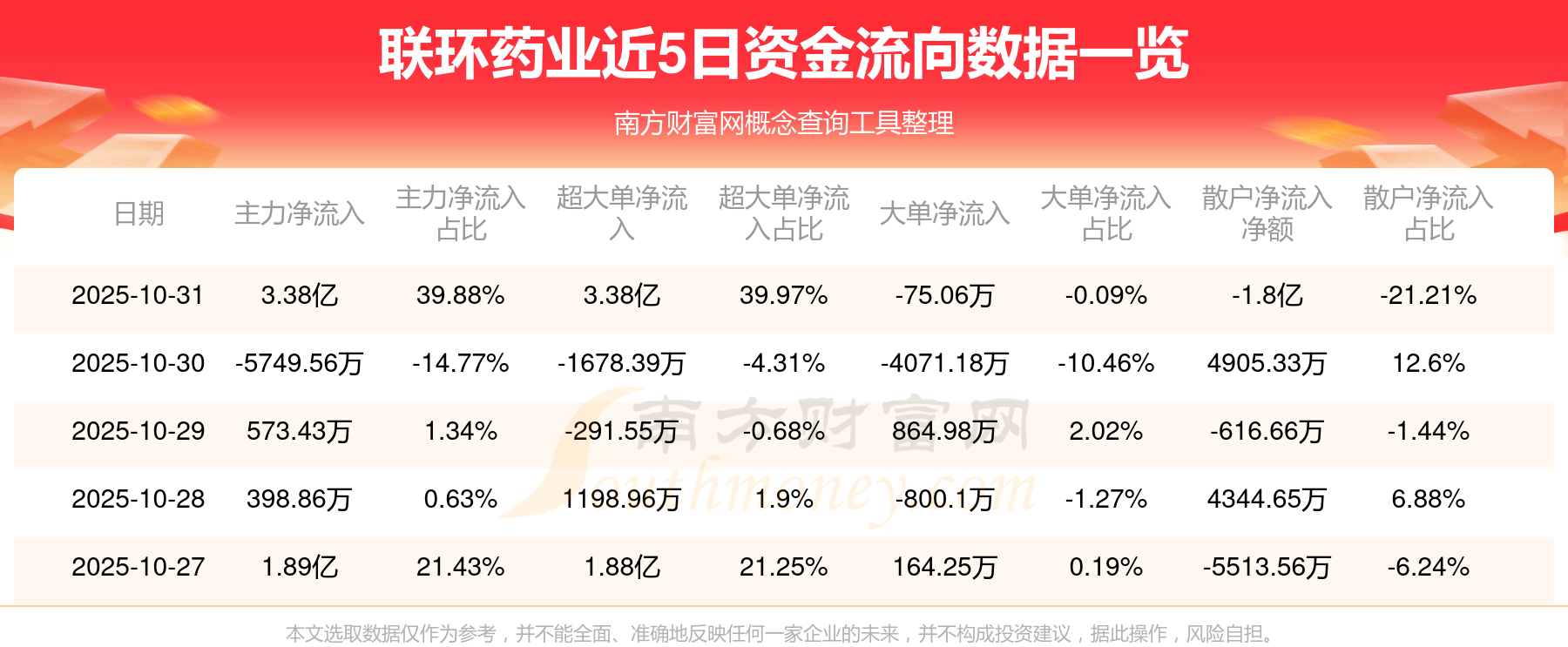10月31日消息,联环药业10月31日主力净流入3.38亿元,超大单净流入3.38亿元,大单净流出75.06万元,散户净流出1.8亿元。