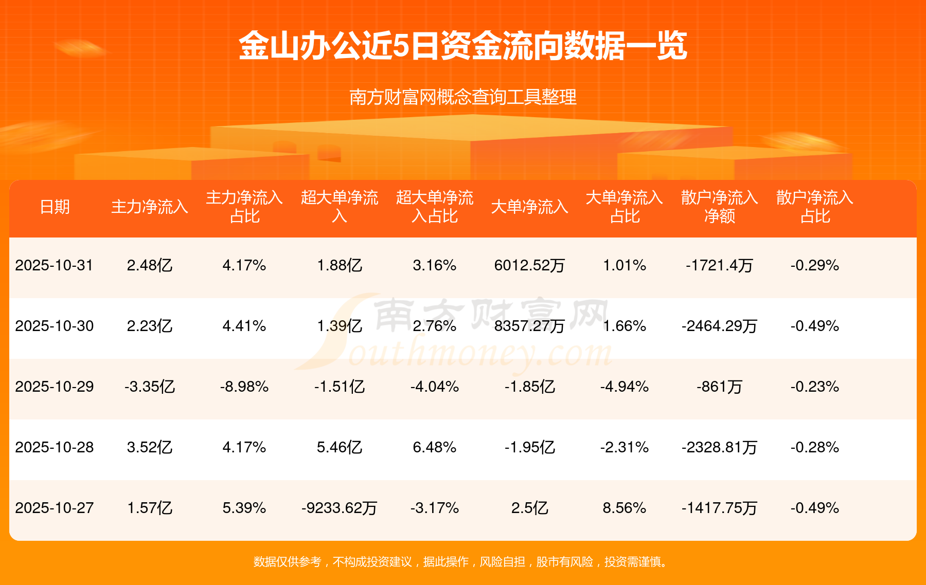 资金流向数据方面,10月31日主力资金净流流入2.48亿元,超大单资金净流入1.88亿元,大单资金净流入6012.52万元,散户资金净流出1721.4万元。