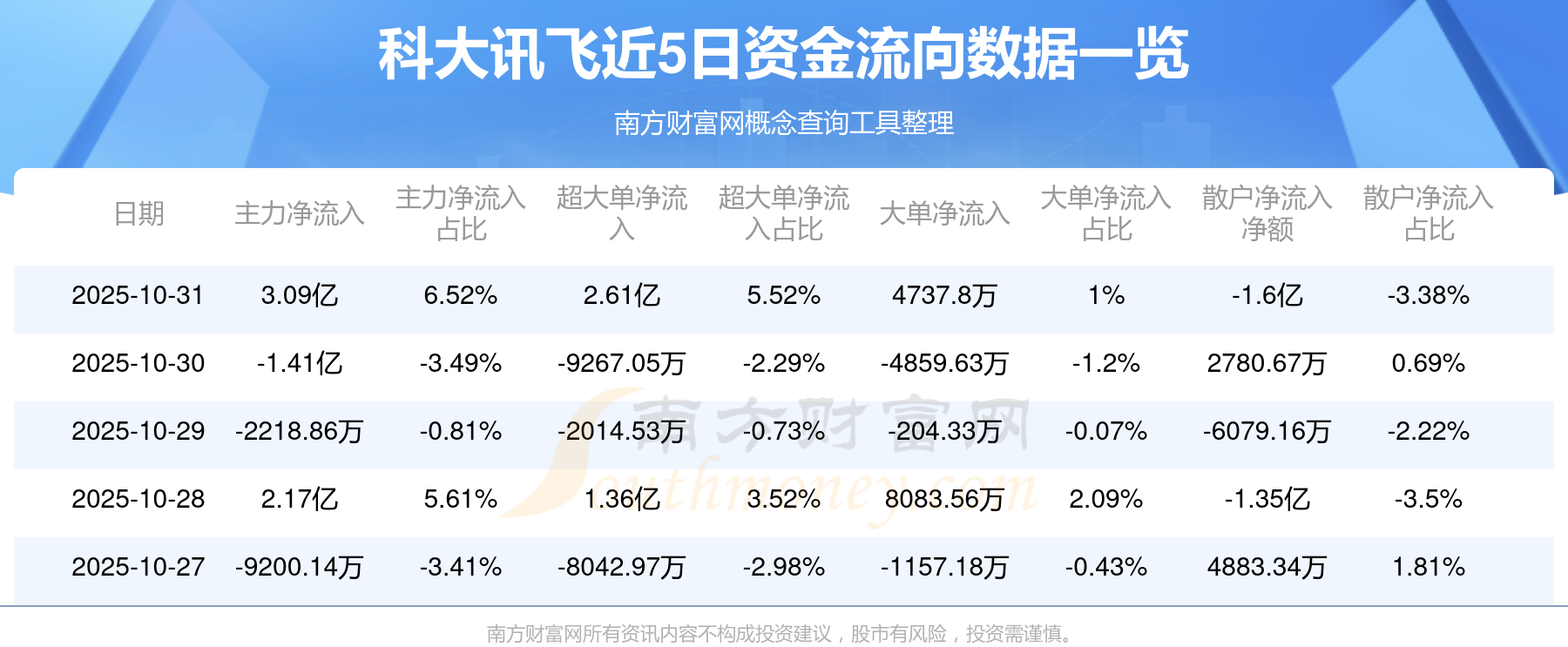 10月31日消息,科大讯飞10月31日主力资金净流入3.09亿元,超大单资金净流入2.61亿元,大单资金净流入4737.8万元,散户资金净流出1.6亿元。