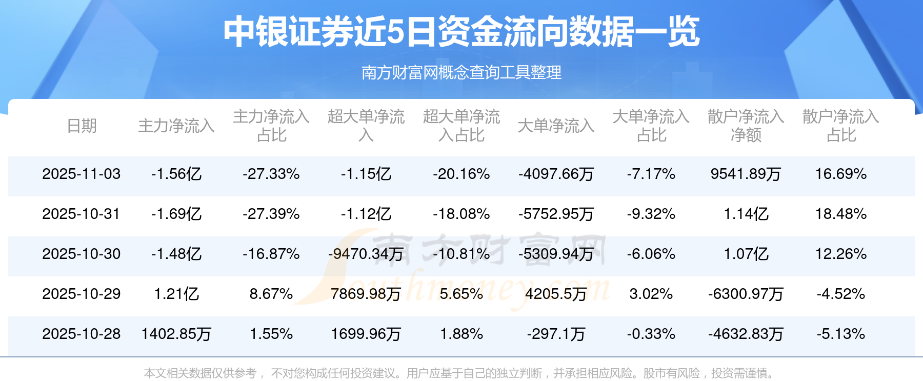 11月3日消息,中银证券主力资金净流出1.56亿元,超大单资金净流出1.15亿元,散户资金净流入9541.89万元。