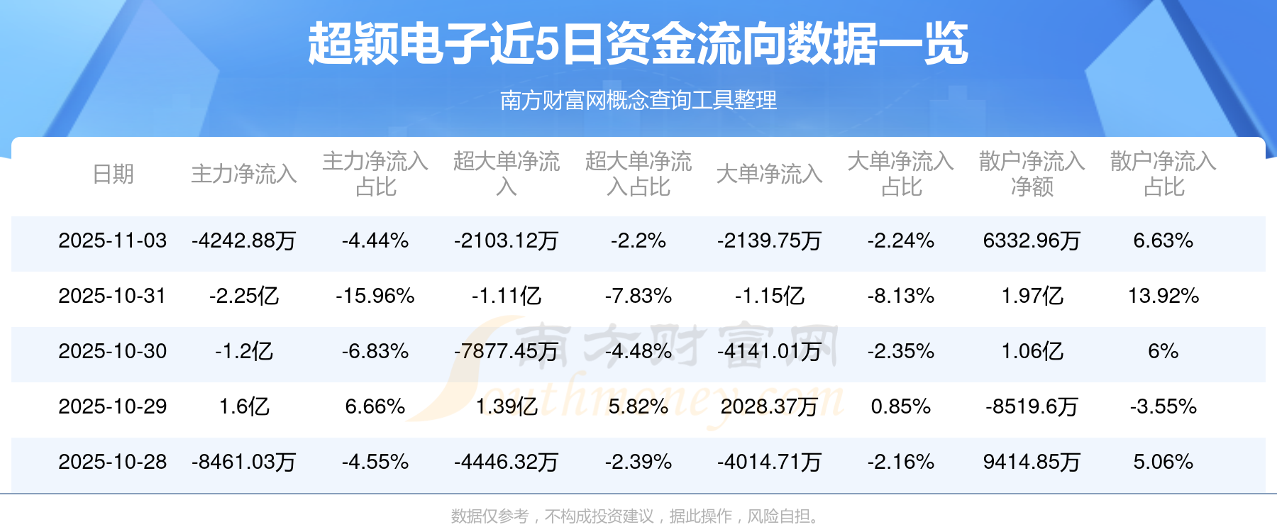 11月3日消息,超颖电子资金净流出4242.88万元,超大单资金净流出2103.12万元,换手率31.76%,成交金额9.56亿元。