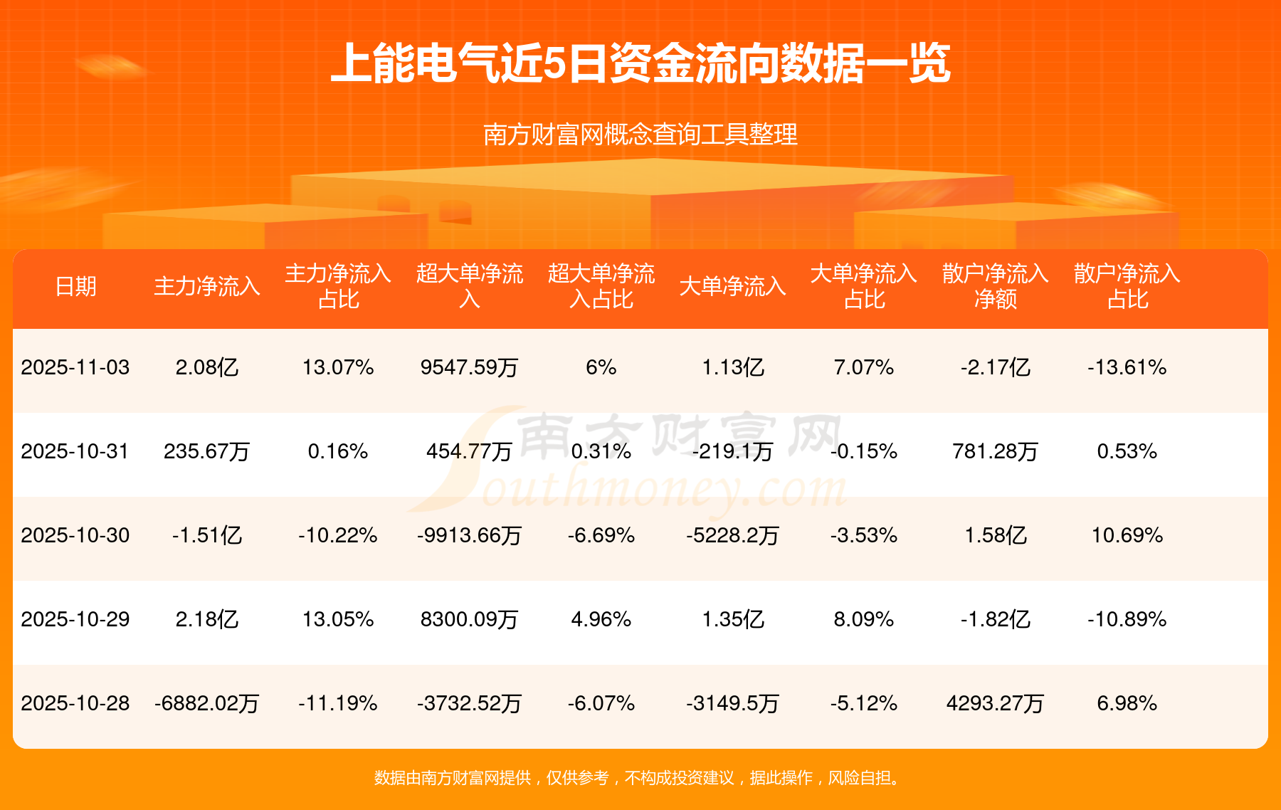 11月3日消息,上能电气主力资金净流入2.08亿元,超大单资金净流入9547.59万元,散户资金净流出2.17亿元。