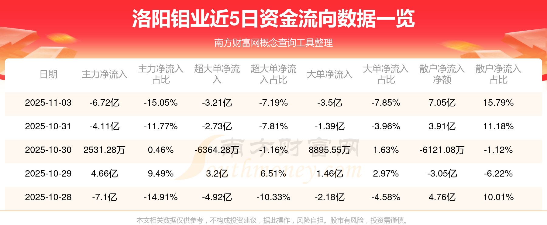 11月3日该股主力净入-6.72亿元,其中资金流入方面:超大单净入7.21亿元,大单净入10.22亿元,中单净入13.17亿元,散户净入13.62亿元;资金流出方面:超大单净出10.42亿元,大单净出13.73亿元,中单净出13.5亿元,散户净出6.57亿元。
