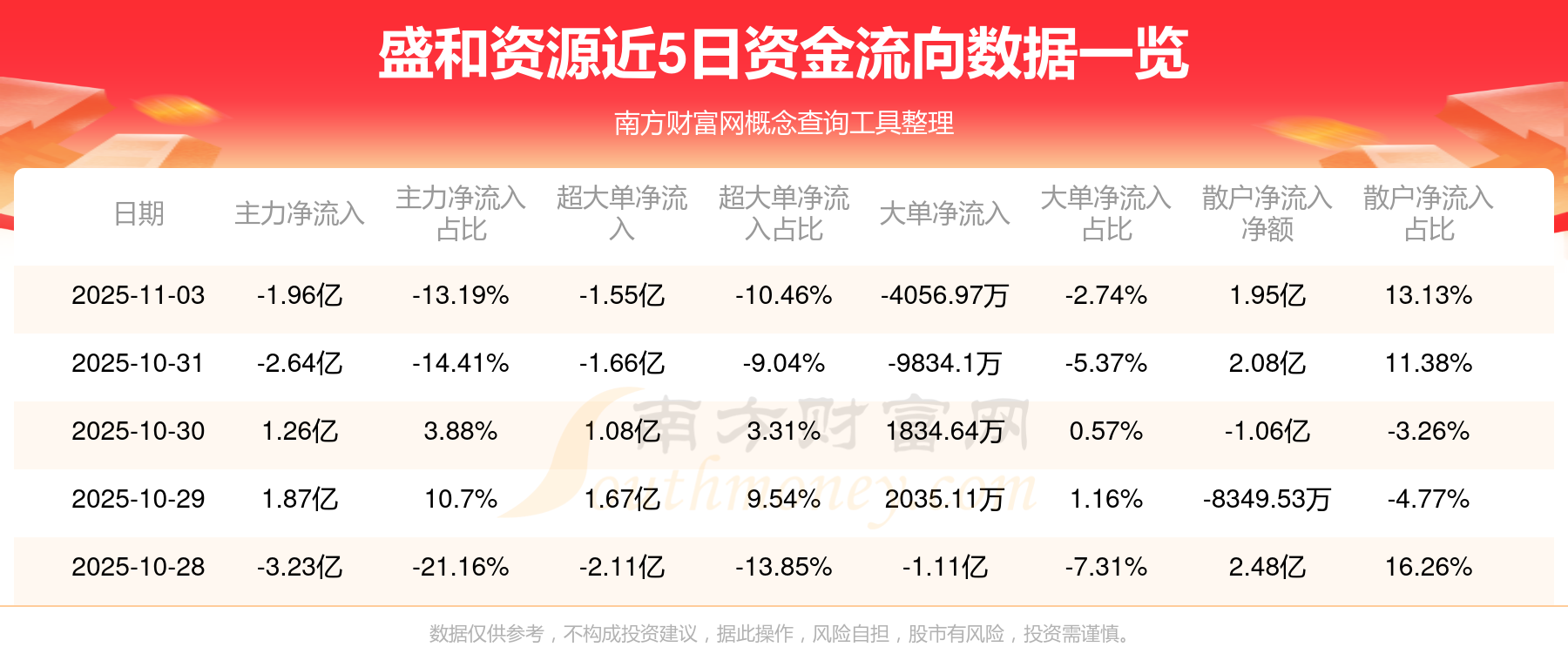 11月3日消息,盛和资源11月3日主力净流出1.96亿元,超大单净流出1.55亿元,大单净流出4056.97万元,散户净流入1.95亿元。