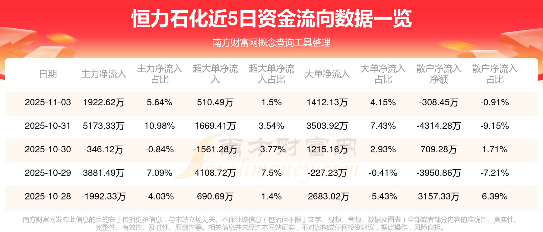 11月3日消息,恒力石化主力净流入1922.62万元,超大单净流入510.49万元,散户净流出308.45万元。