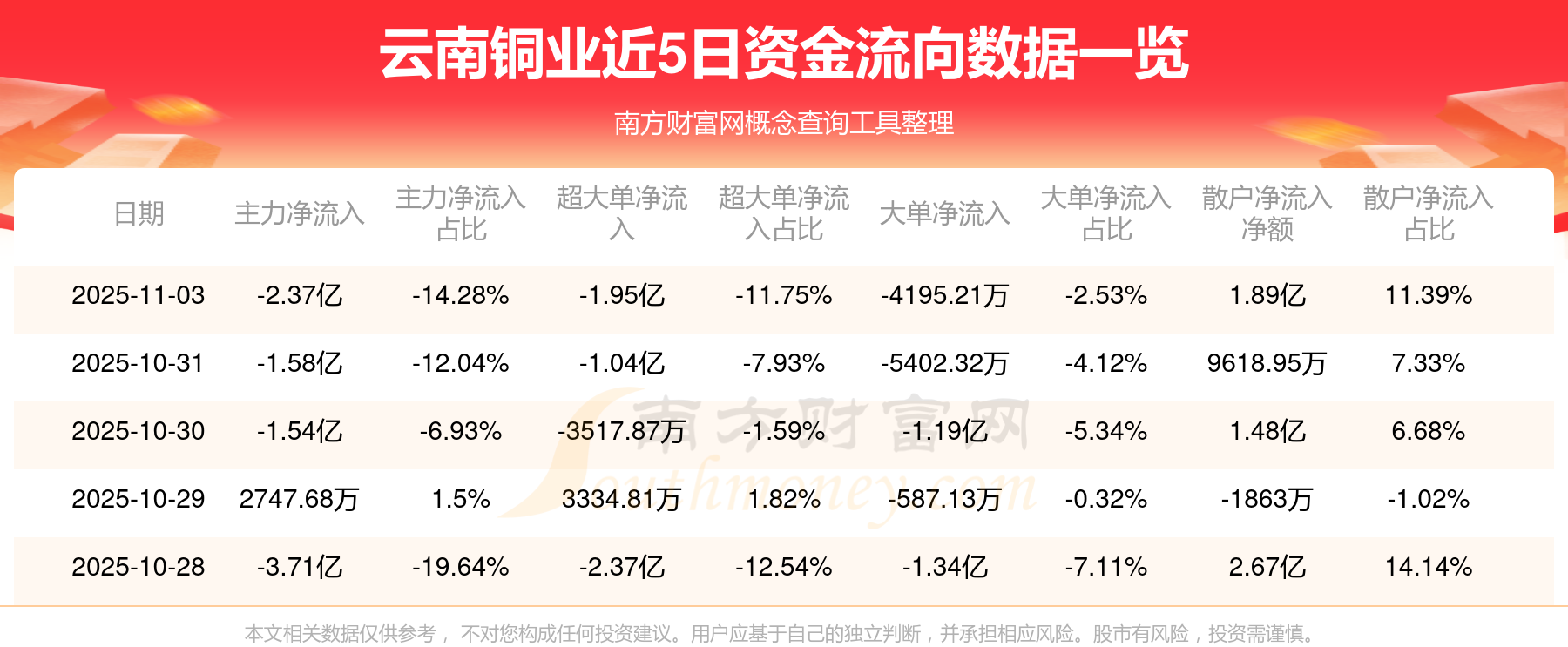11月3日消息,云南铜业11月3日主力资金净流出2.37亿元,超大单资金净流出1.95亿元,大单资金净流出4195.21万元,散户资金净流入1.89亿元。