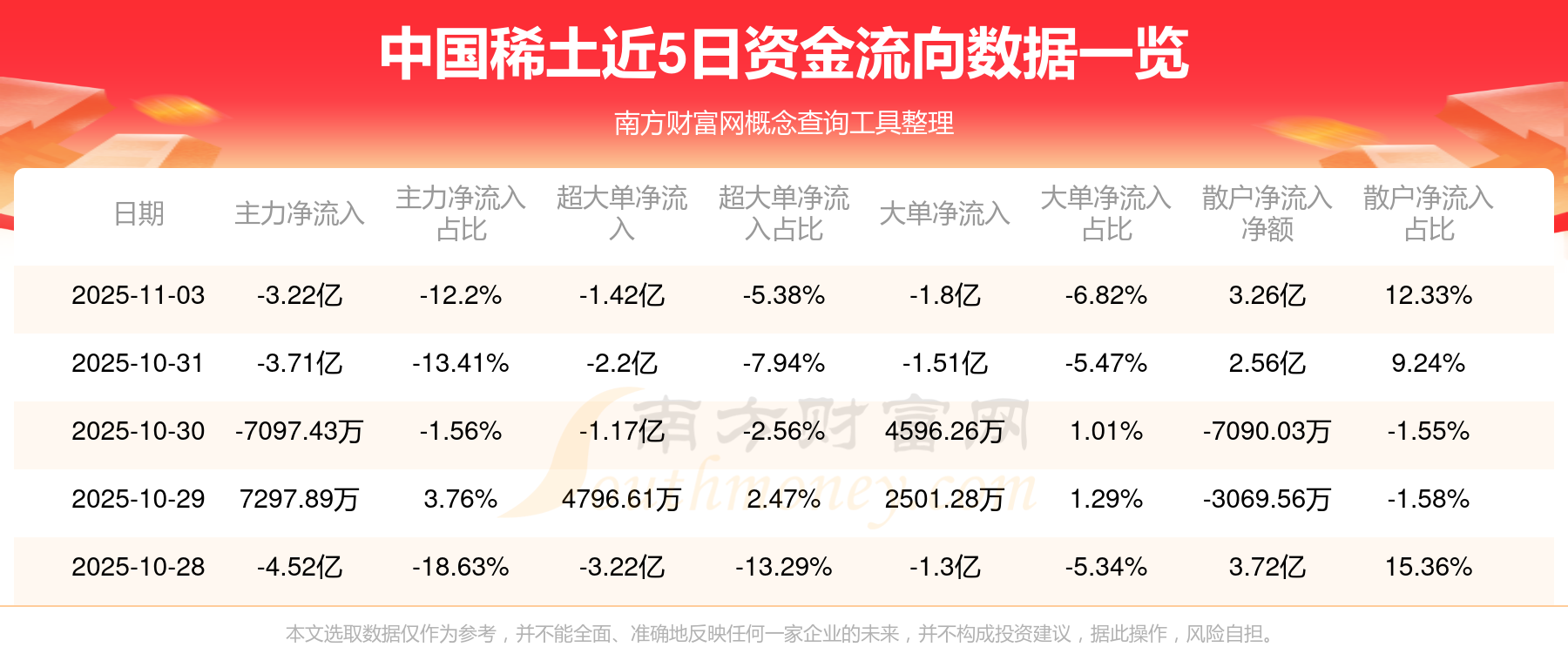 11月3日消息,中国稀土11月3日主力净流出3.22亿元,超大单净流出1.42亿元,大单净流出1.8亿元,散户净流入3.26亿元。