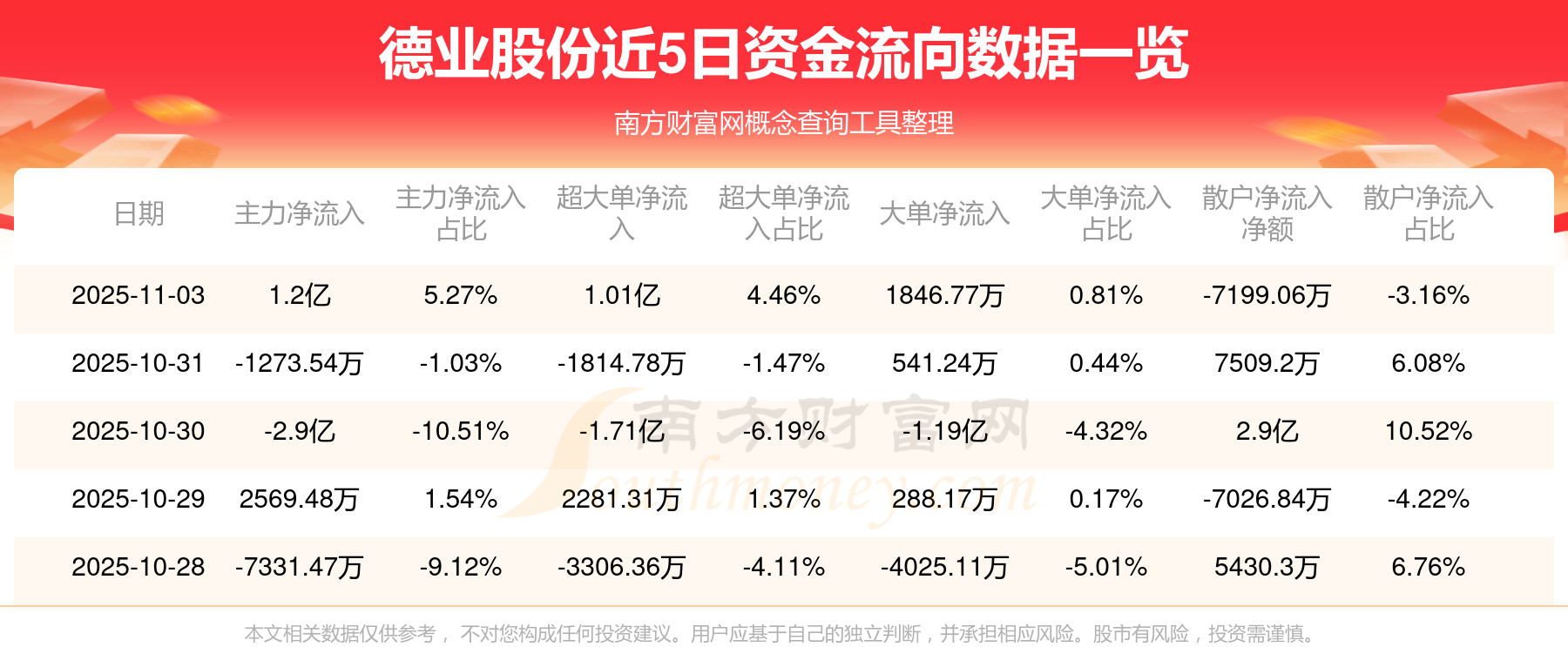 11月3日消息,德业股份主力净流入1.2亿元,超大单净流入1.01亿元,散户净流出7199.06万元。