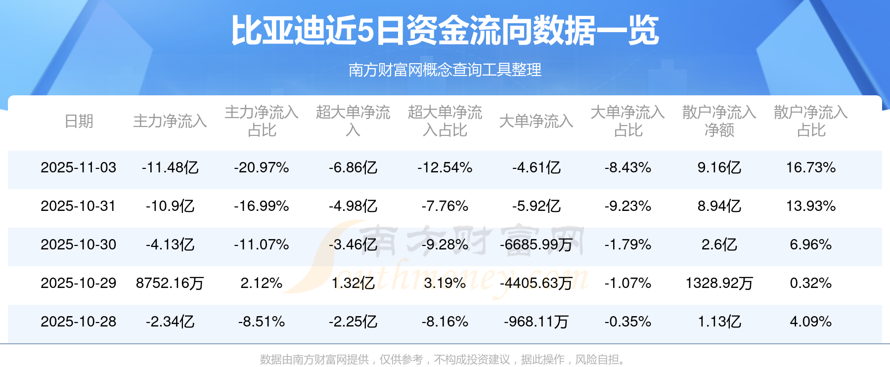 11月3日消息,比亚迪11月3日主力净流出11.48亿元,超大单净流出6.86亿元,大单净流出4.61亿元,散户净流入9.16亿元。